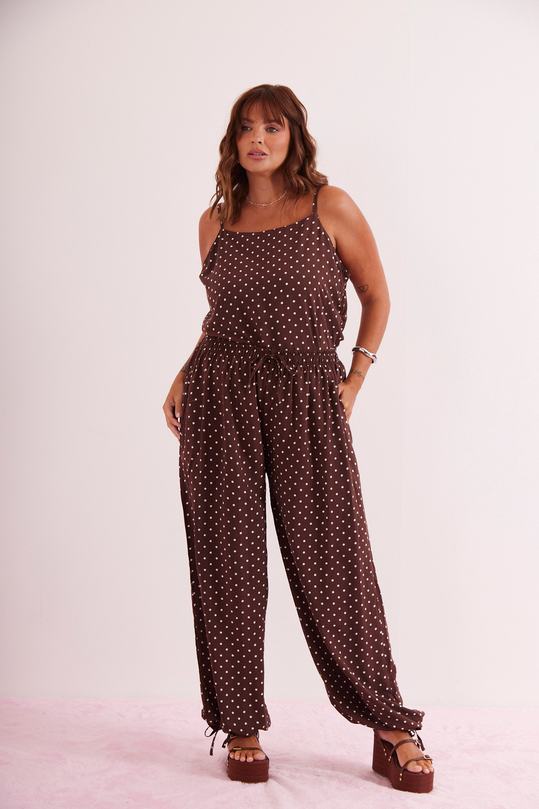 Blusa de alça em poá com estampa clássica e toque contemporâneo. Possui busto reto que valoriza o colo com elegância e detalhe assimétrico na barra em formato de “V” na lateral, trazendo um charme inesperado ao look. Com fundo preto e bolinhas off, é perfeita para quem ama um visual feminino com personalidade.