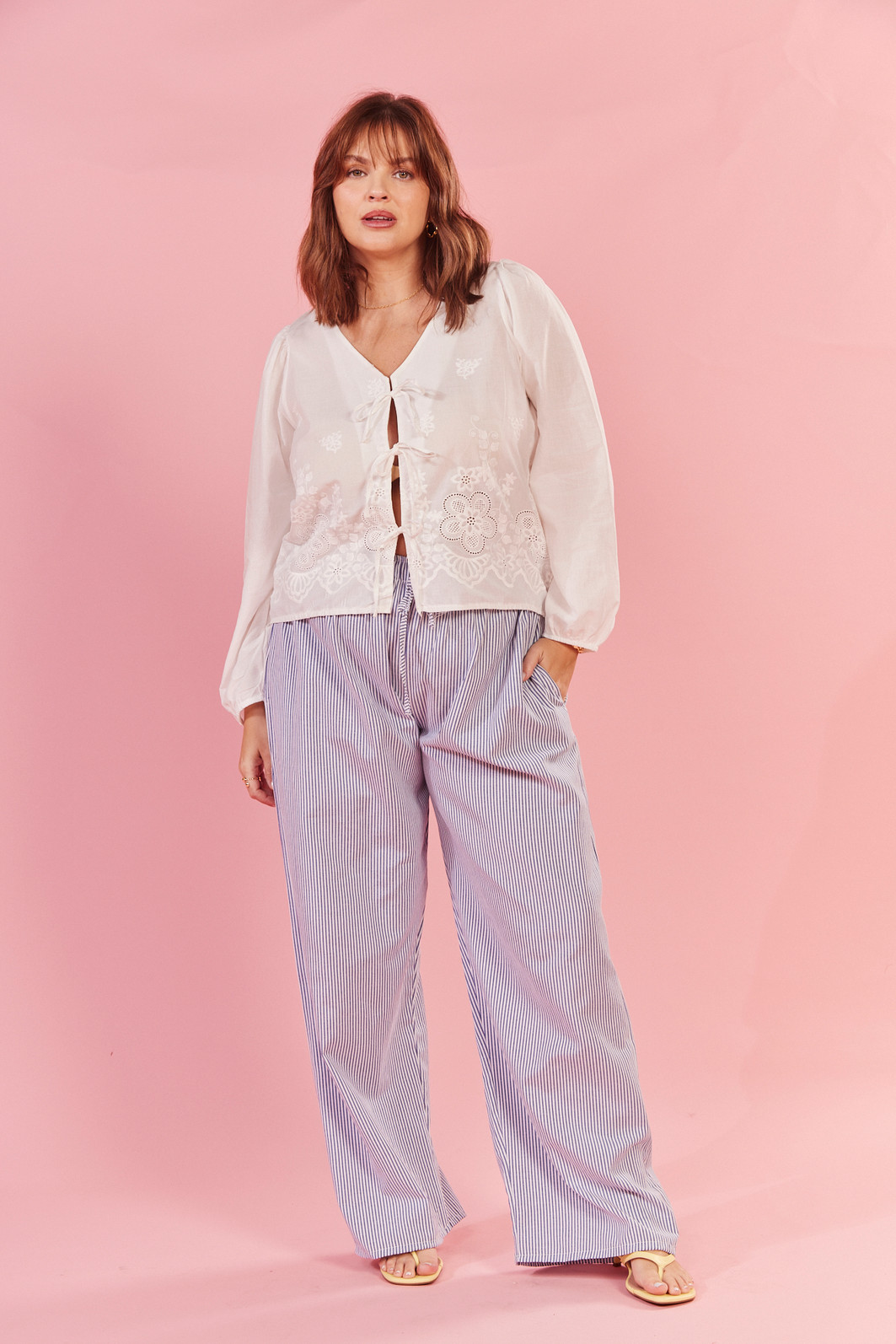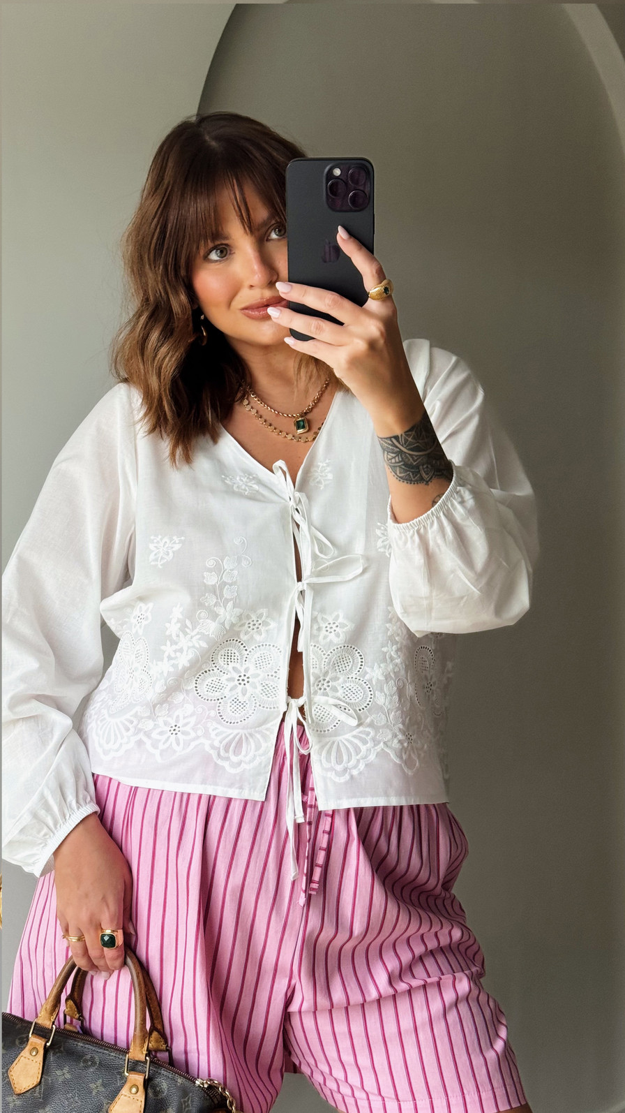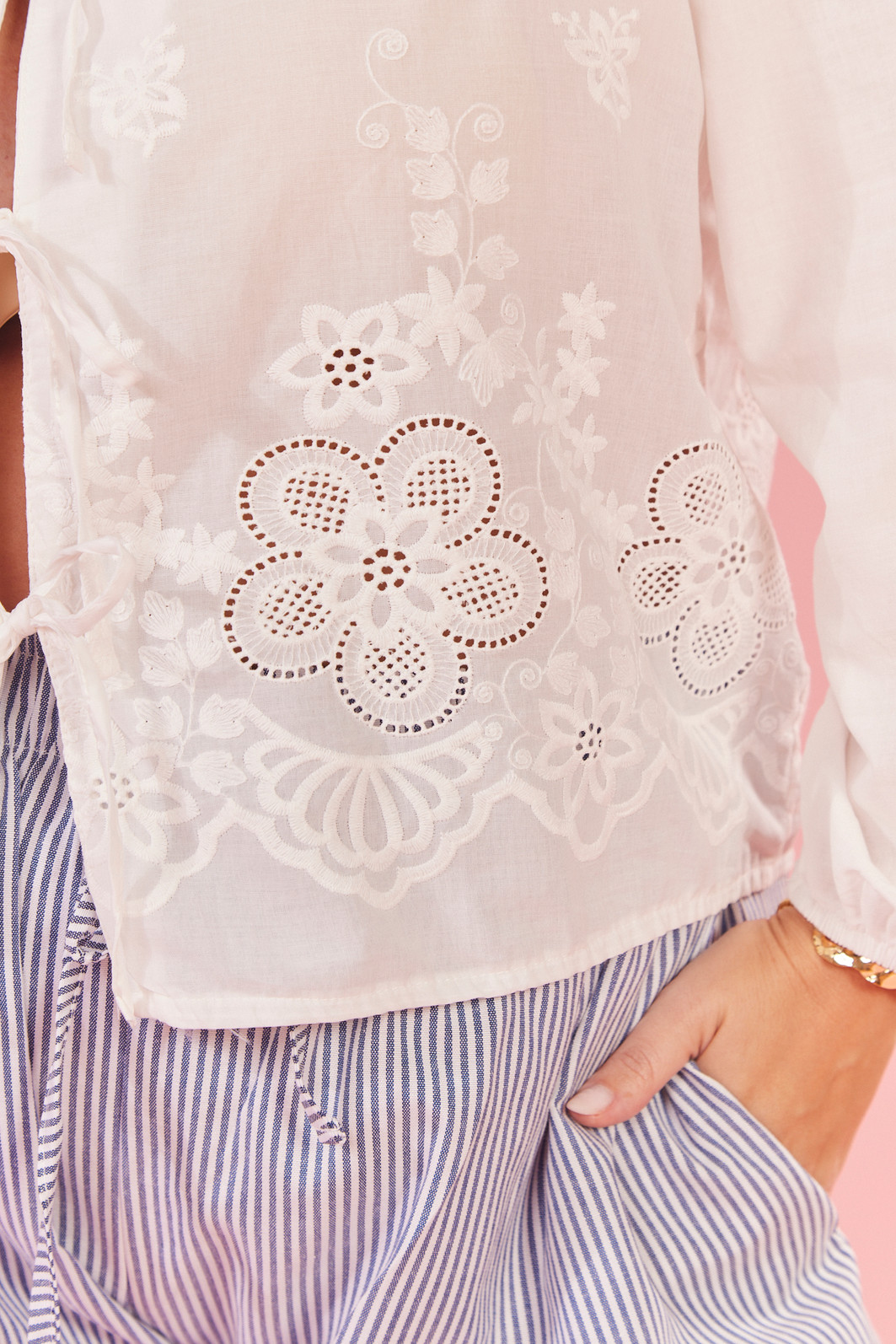 Blusa de manga longa em laise, com fechamento em friso frontal que permite um delicado lacinho, trazendo ainda mais charme à peça. As mangas com elástico garantem conforto e um toque sutil de volume. Leve e feminina, é perfeita para composições românticas e cheias de delicadeza.Não acompanha forro.