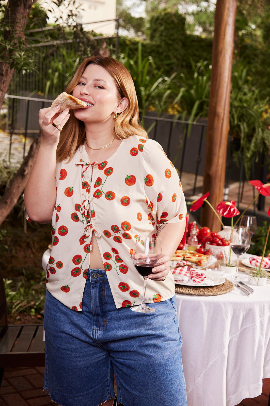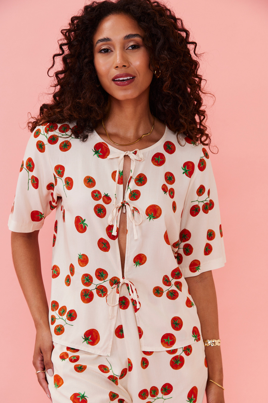 Delicada, divertida e cheia de charme! Nossa blusa tomatinhos é feita em tecido leve e tem caimento soltinho, perfeita para os dias mais frescos e ensolarados. A estampa de tomatinhos traz um ar retrô e super fofo, enquanto os laços frontais dão um toque romântico e descolado. Ideal para compor looks casuais com um toque de originalidade. Combine com jeans, saias ou alfaiataria para um visual cheio de estilo! 🍅
