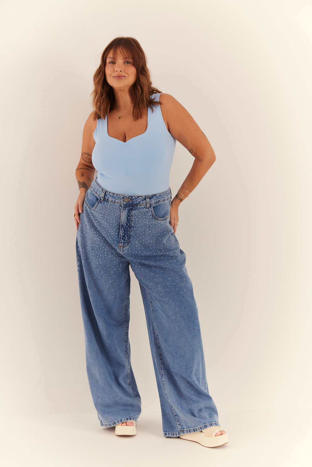 Calça jeans feminina com strass o brilho que seu look merece! Com modelagem ampla e caimento leve, essa peça une conforto e estilo em um só jeans. Os detalhes em strass na parte frontal garantem um toque moderno e sofisticado, perfeito para compor produções casuais ou noturnas. ✨