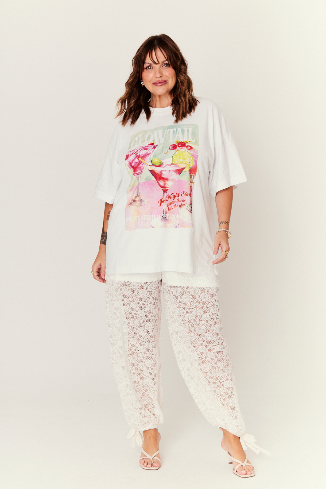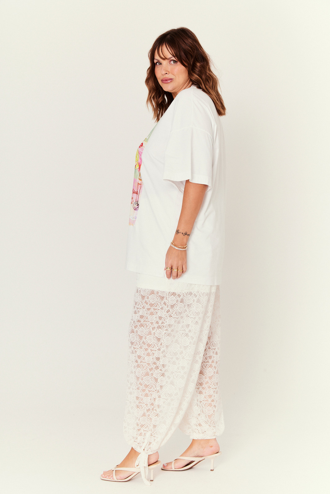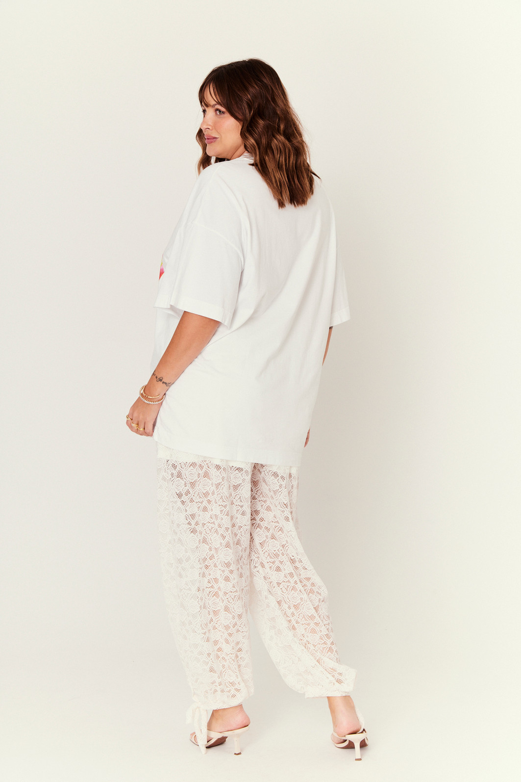 Calça aladim confeccionada em renda delicada, com forro parcial e transparência suave nas pernas. Apresenta modelagem solta, cós confortável e punhos ajustados, garantindo leveza e elegância ao visual. Perfeita para compor looks sofisticados e cheios de estilo.