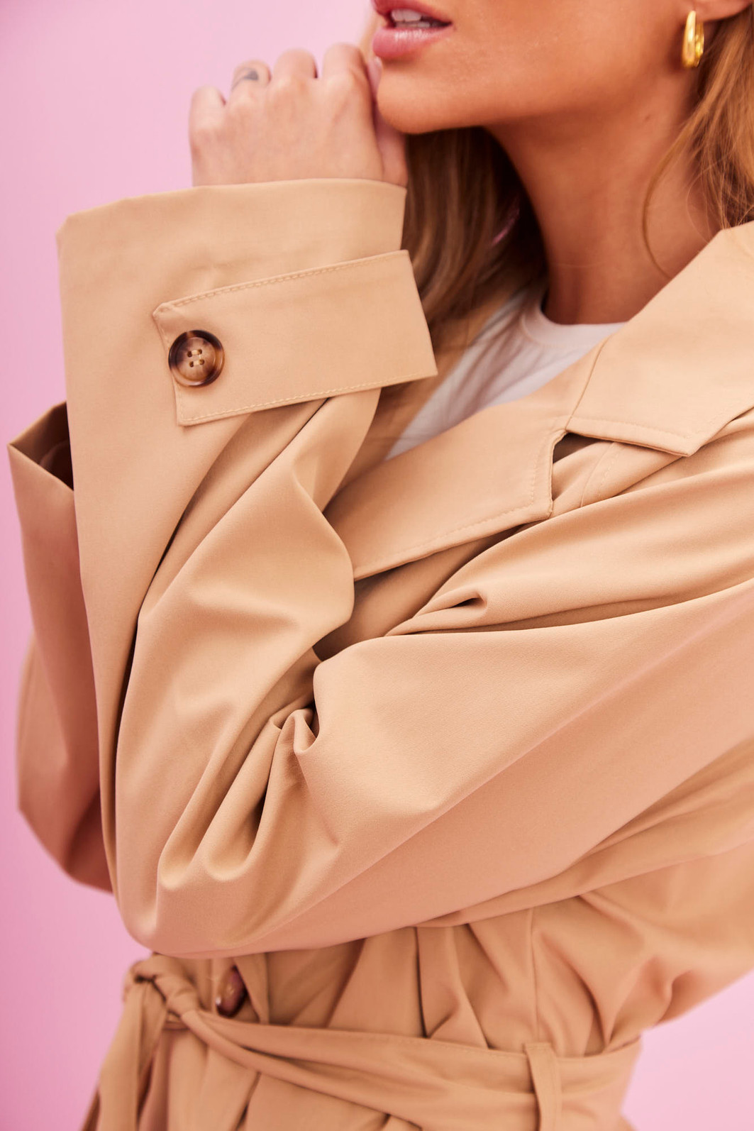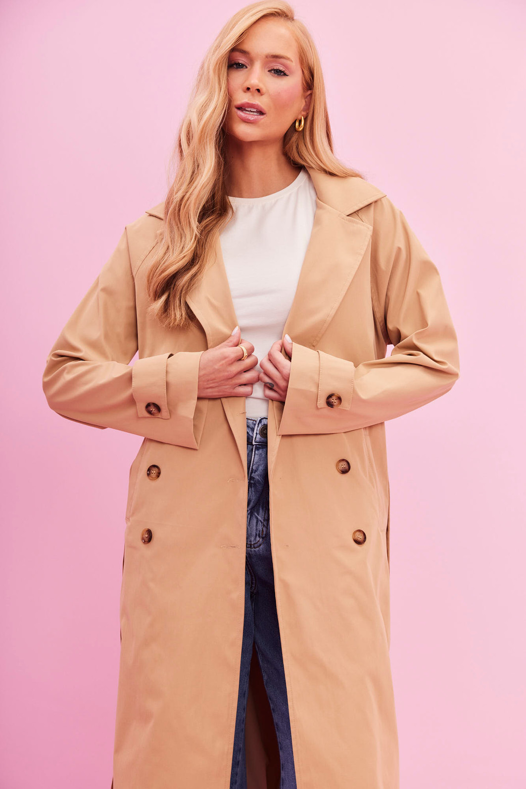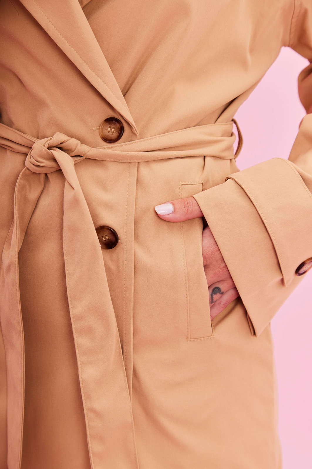 O trench Coat em alfaiataria que transforma qualquer look. Clássico, elegante e super atual, ele tem comprimento midi, bolsos laterais e fechamento por botões, além de faixa para amarração que valoriza a silhueta e deixa a produção ainda mais chic.