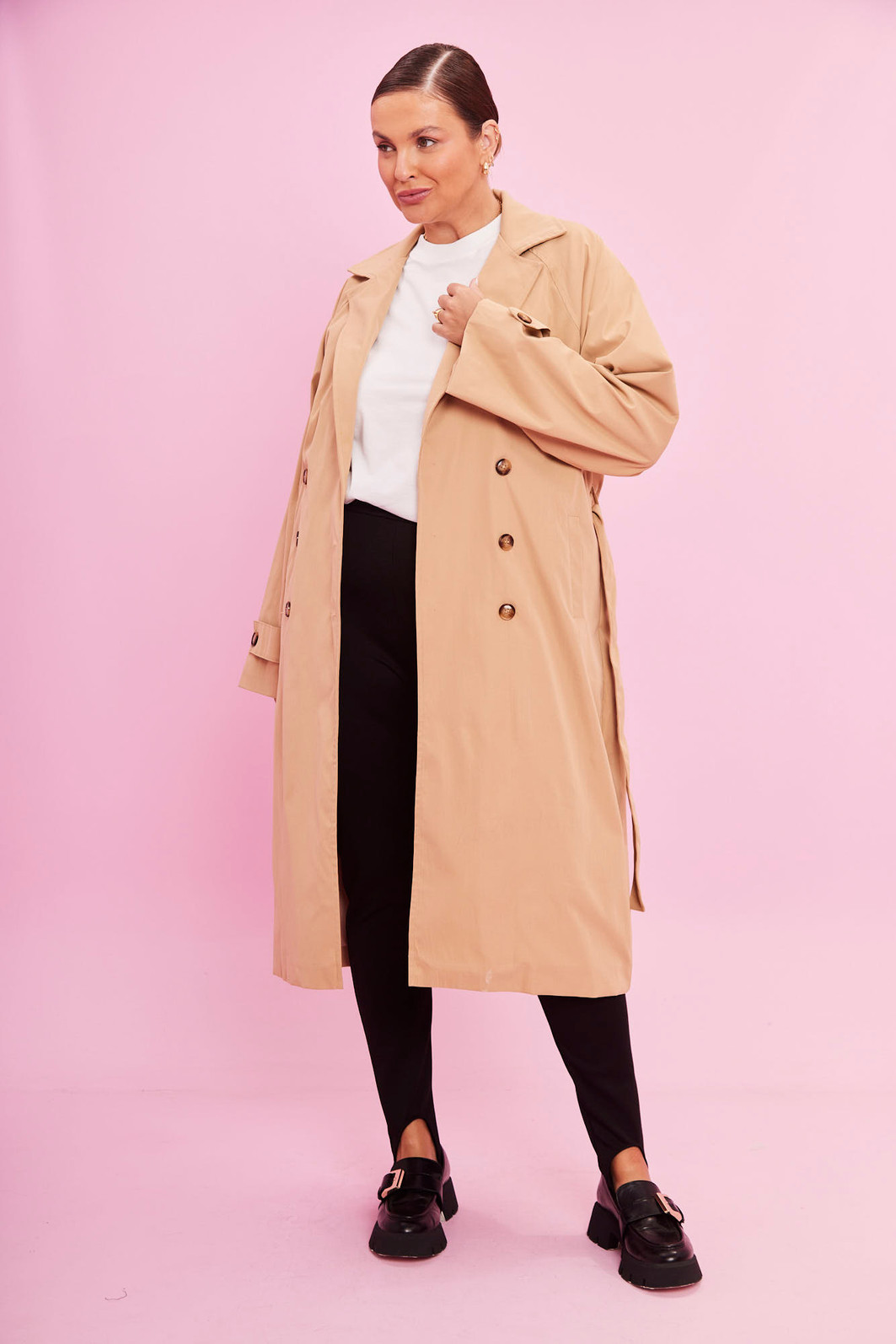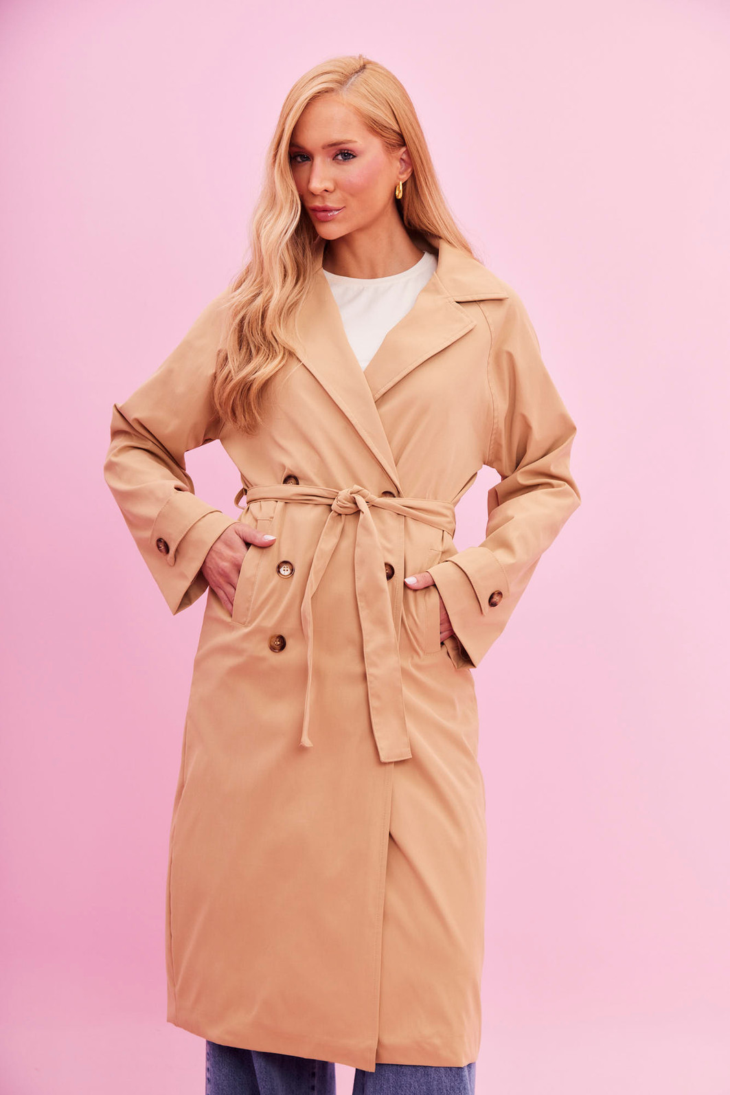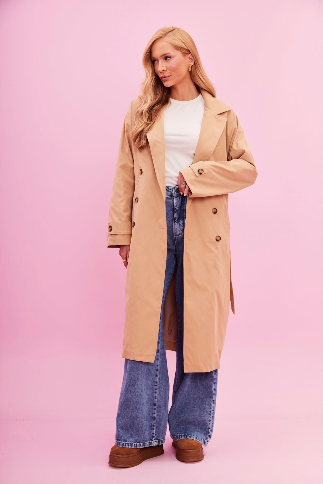 O trench Coat em alfaiataria que transforma qualquer look. Clássico, elegante e super atual, ele tem comprimento midi, bolsos laterais e fechamento por botões, além de faixa para amarração que valoriza a silhueta e deixa a produção ainda mais chic.