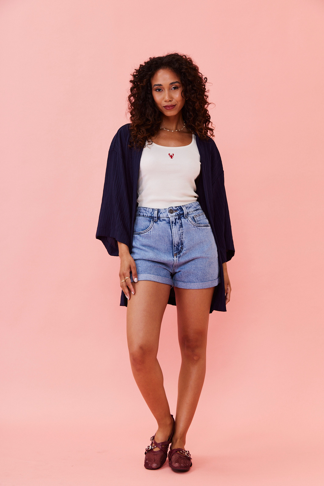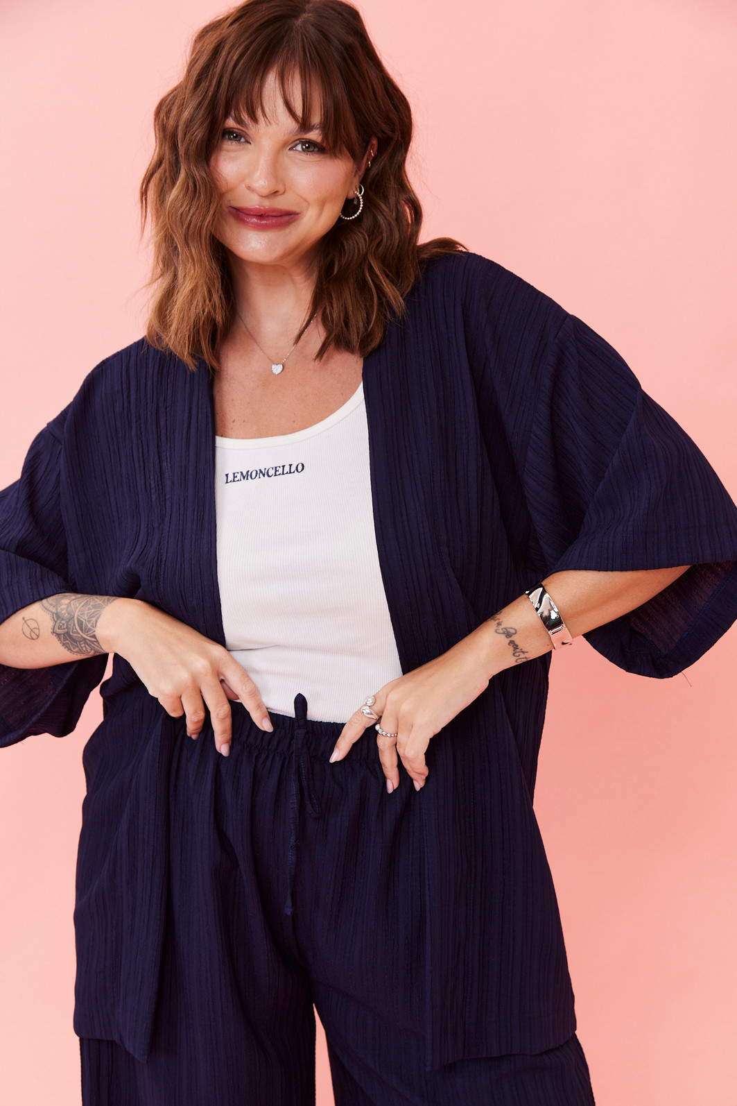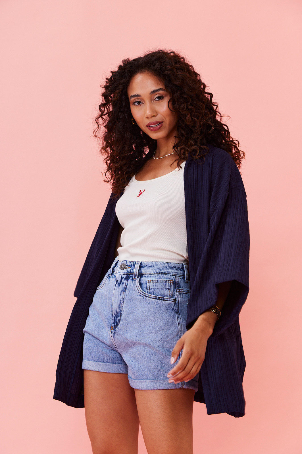 Um kimono leve, estiloso e cheio de personalidade. Com caimento fluido e mangas amplas, ele traz movimento e conforto na medida certa. Pensada para valorizar cada detalhe. Perfeito para sobrepor looks básicos ou complementar produções mais elaboradas, ele é aquele tipo de peça que transforma o visual com elegância e originalidade.