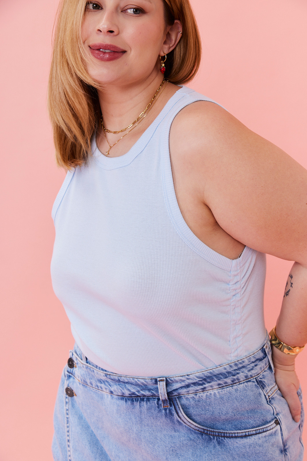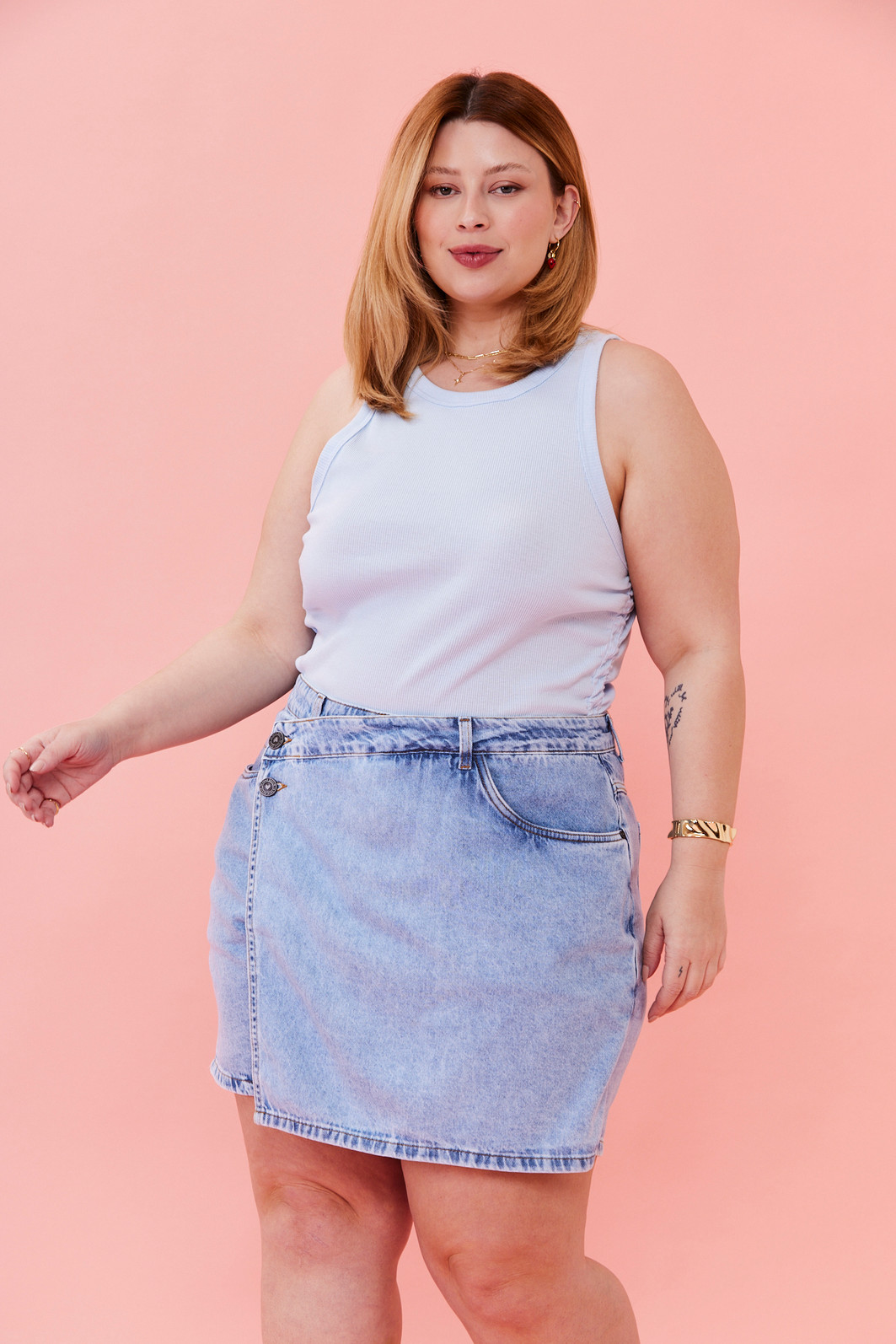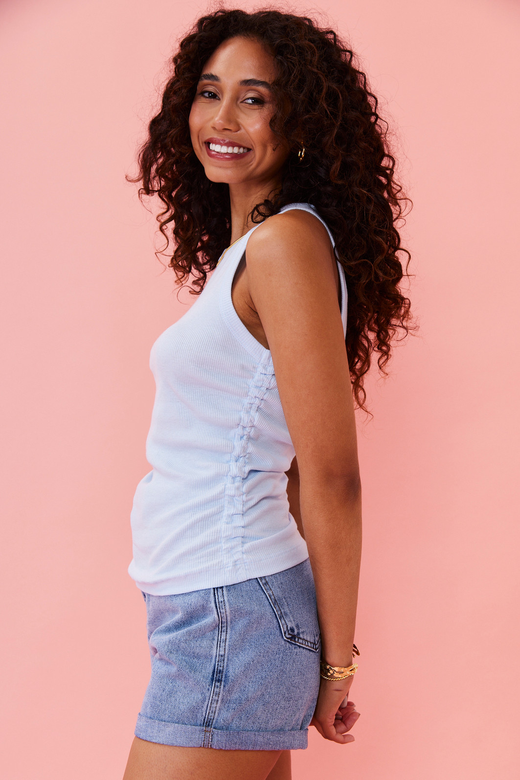 Regata com modelagem ajustada ao corpo, ideal para compor looks versáteis e confortáveis. Possui detalhe lateral franzido que valoriza a silhueta e acabamento canelado, trazendo um toque moderno e casual para o dia a dia.