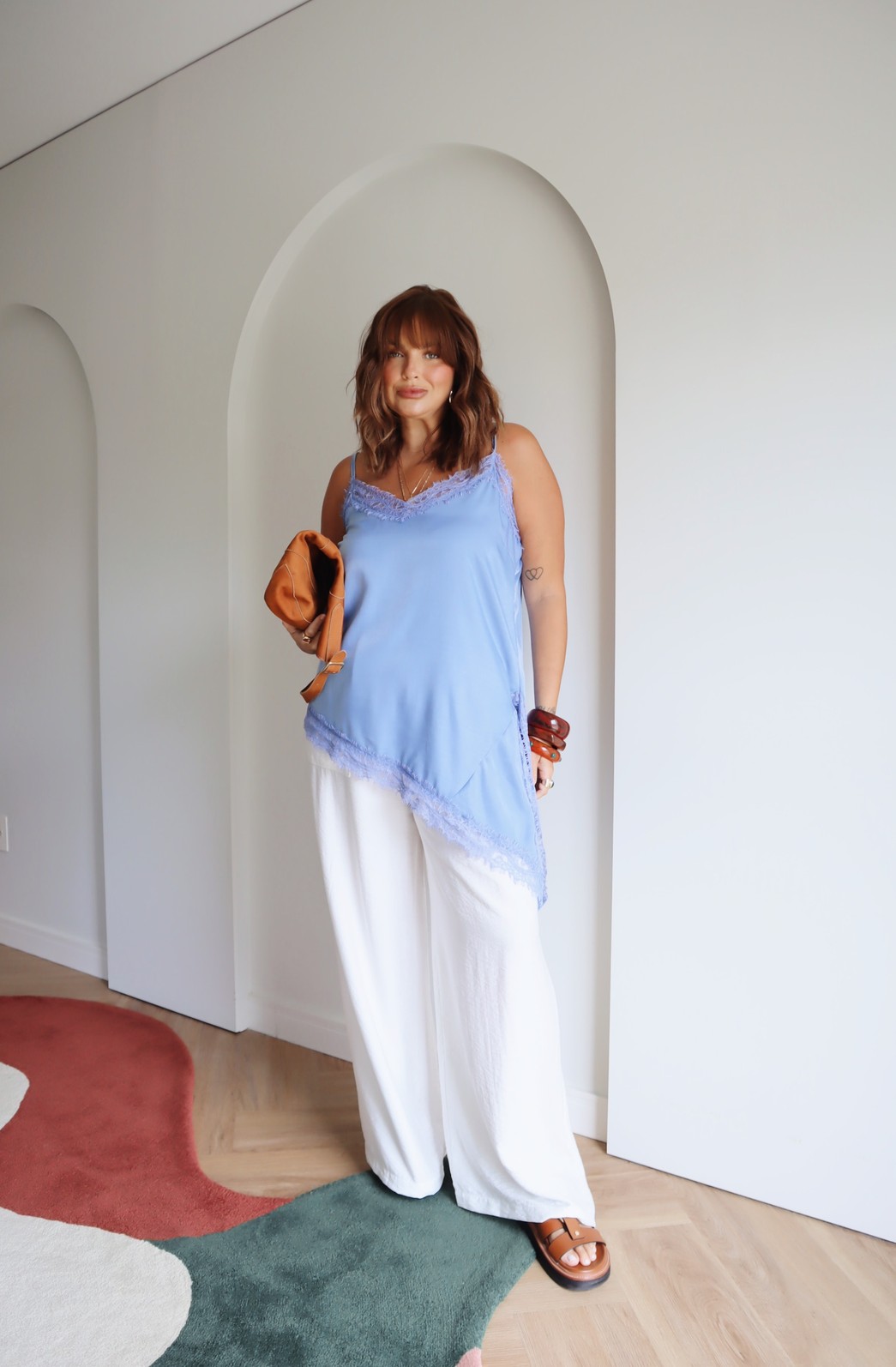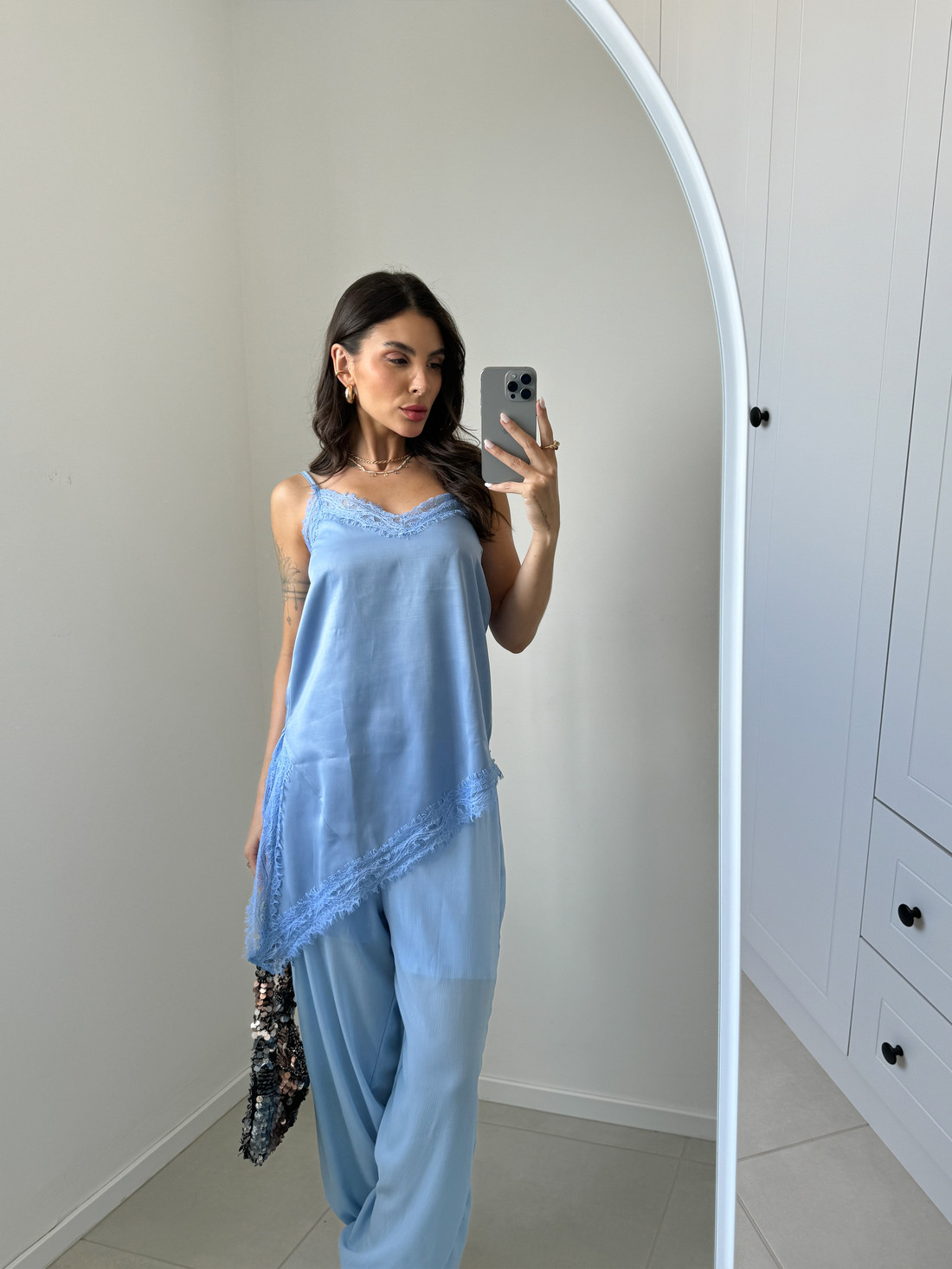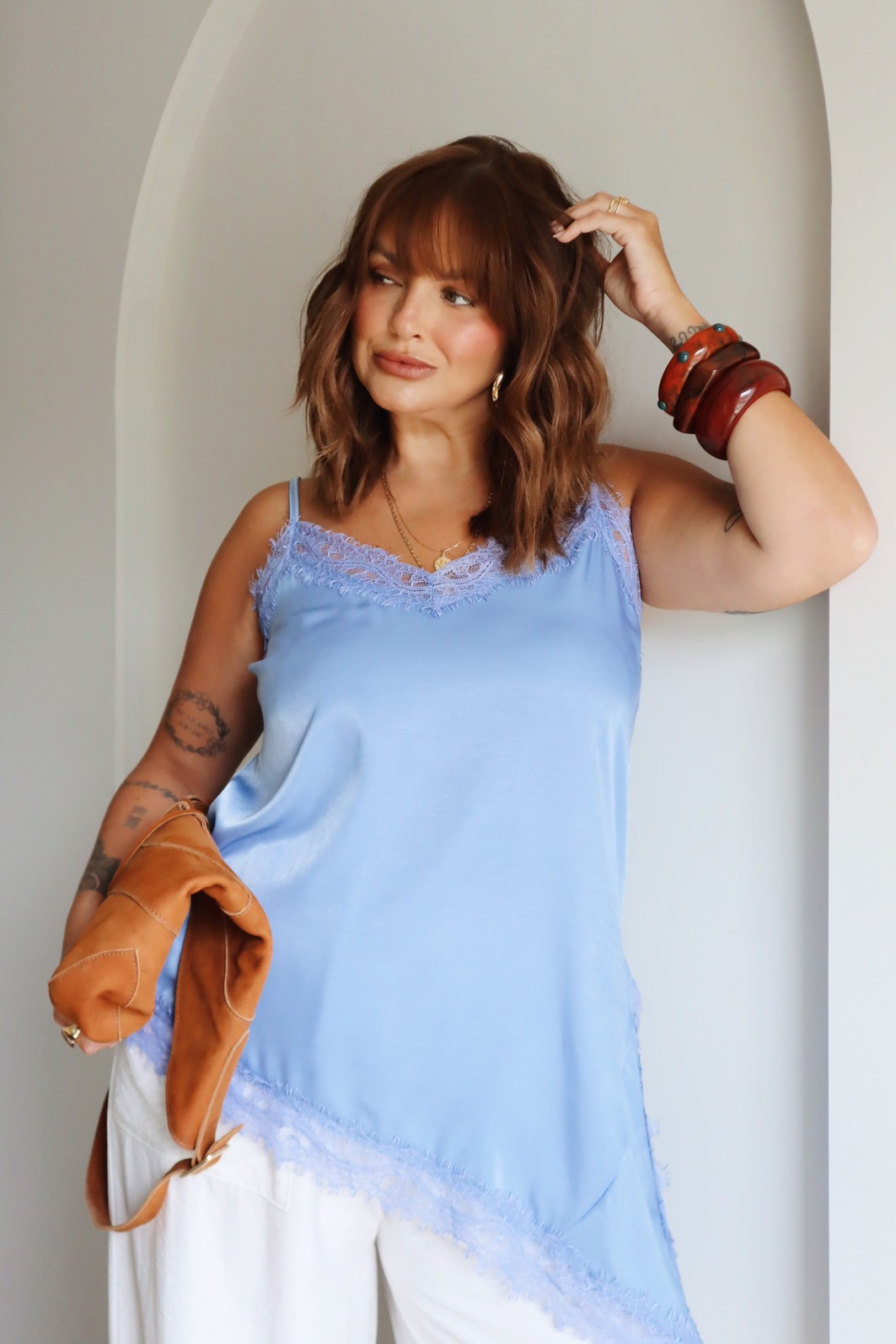 Uma peça delicada e cheia de charme. Com alças finas e acabamento em renda no decote e na barra, essa regata traz um toque romântico ao visual. O caimento soltinho garante conforto e elegância, ideal para compor looks leves e versáteis para diversas ocasiões.