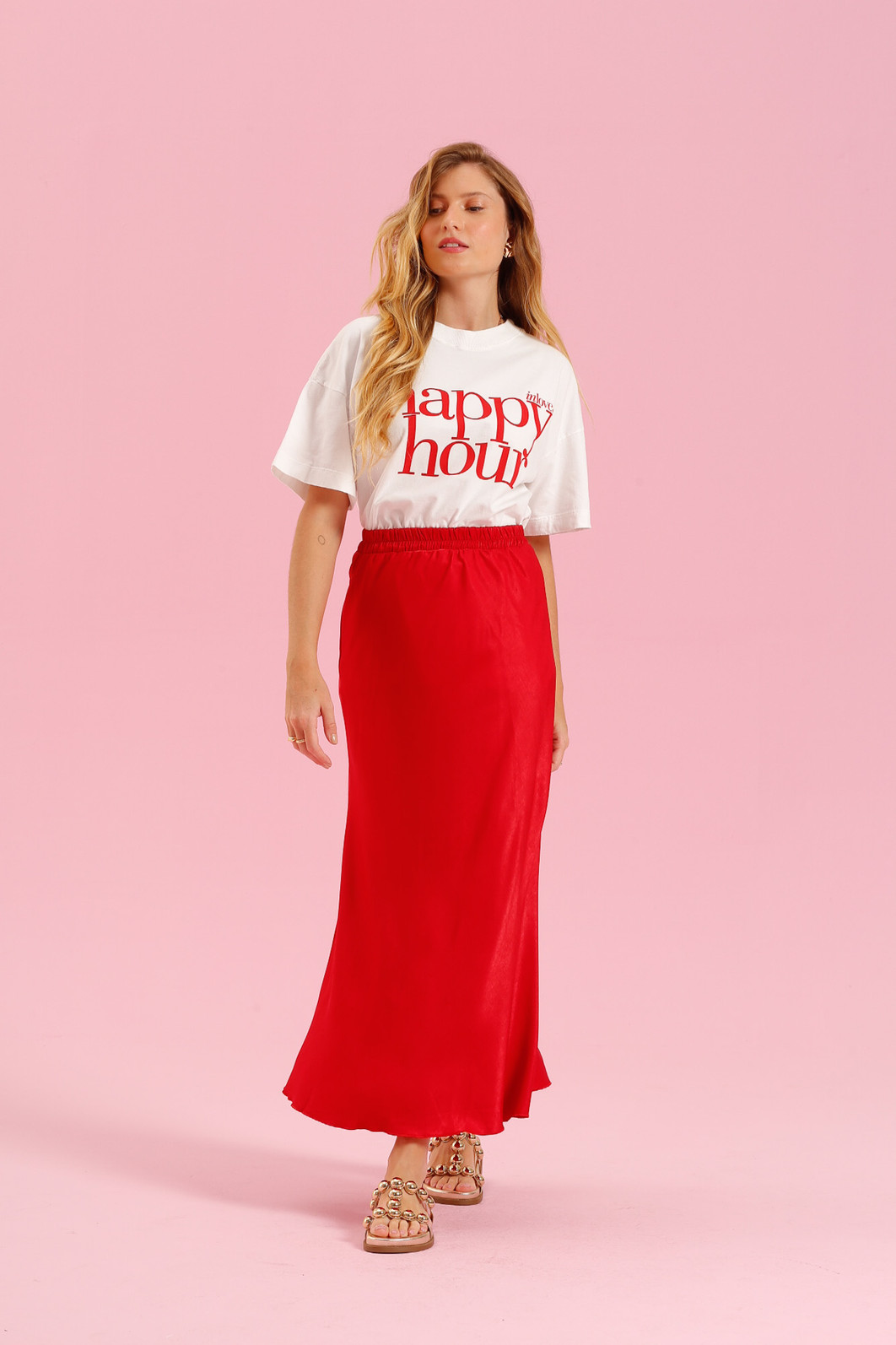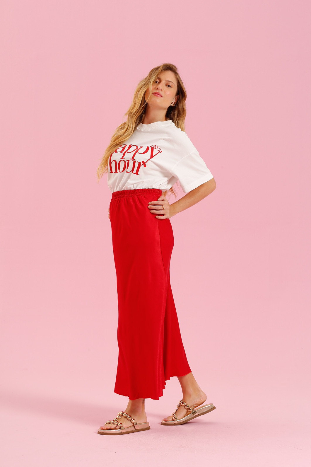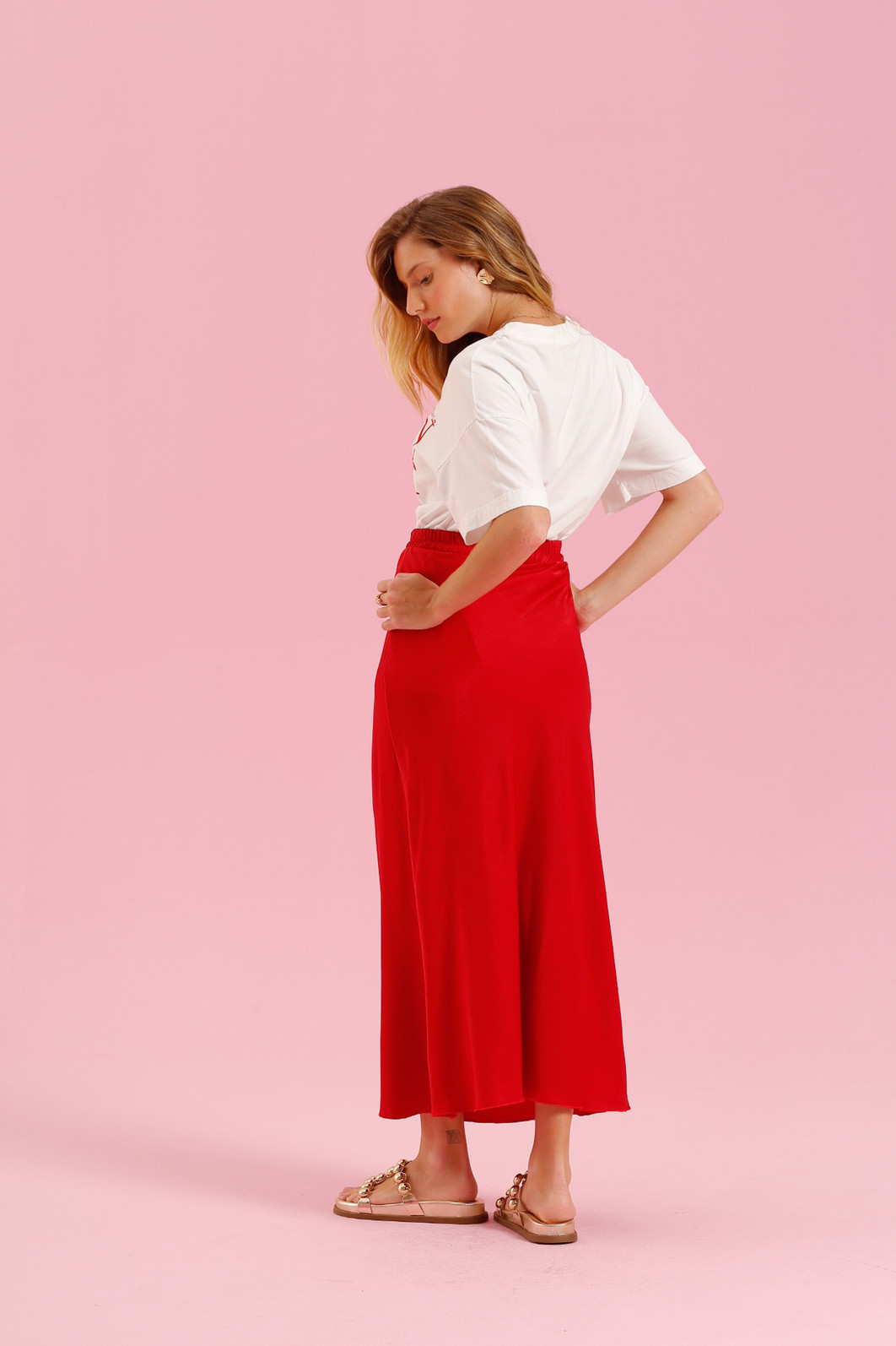 Saia midi alongada com elástico na cintura, proporcionando conforto e ajuste perfeito. Seu caimento leve e fluido confere um visual moderno e elegante. A modelagem de cintura alta e o babado na barra adicionam um toque de charme.