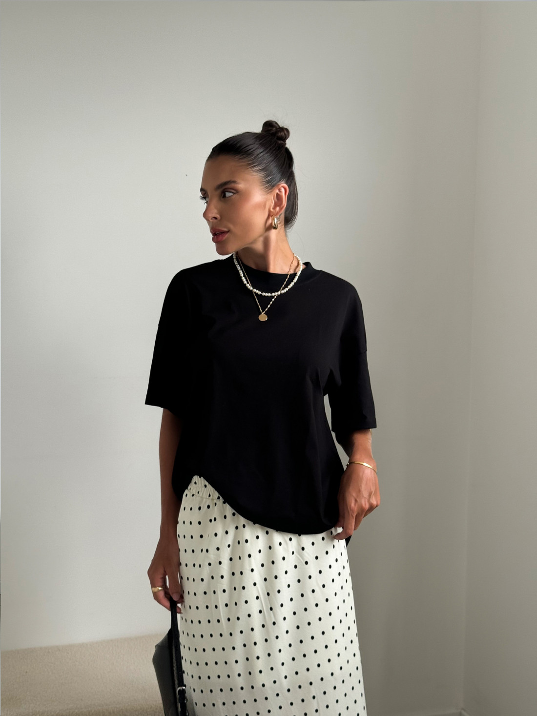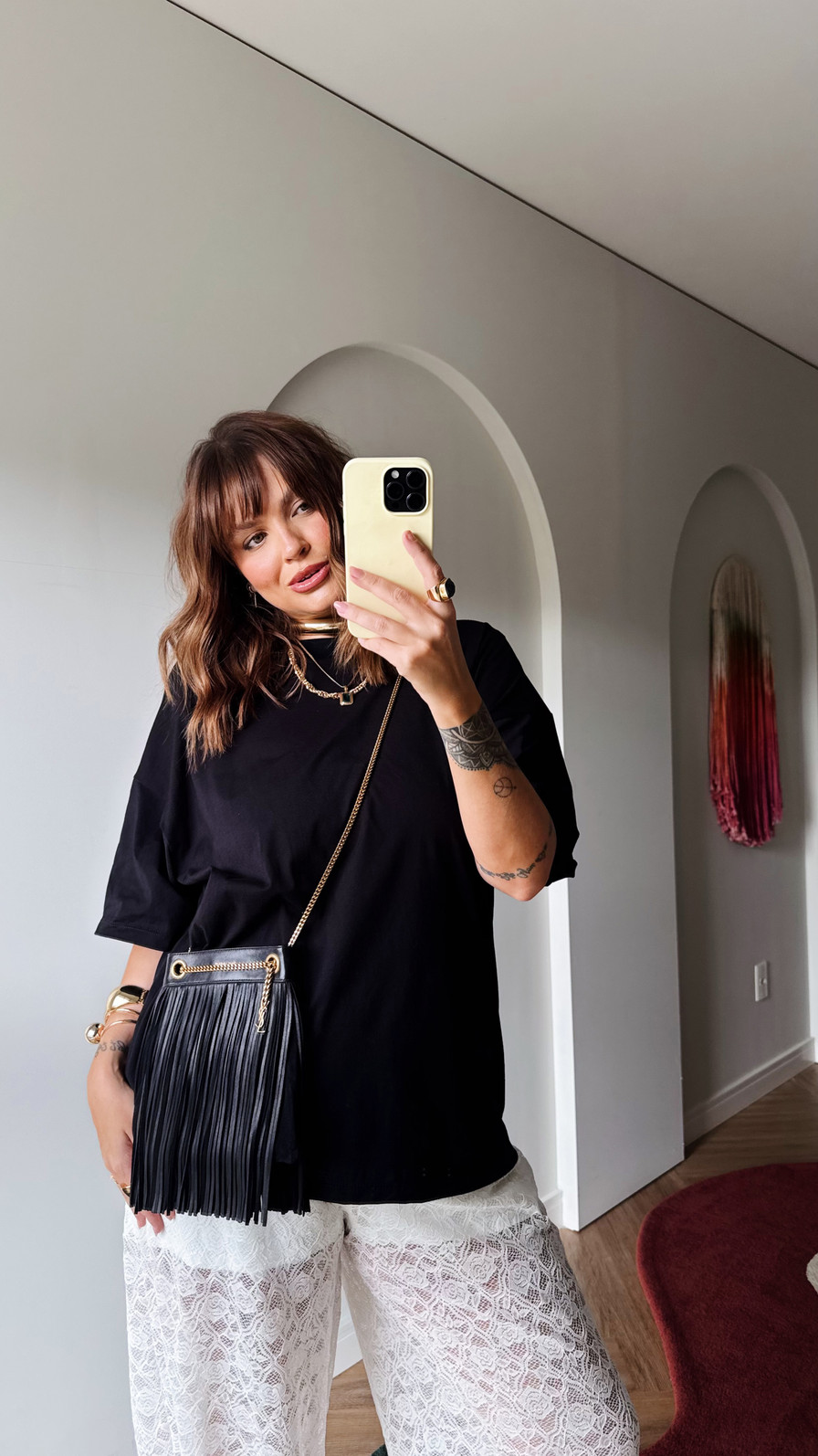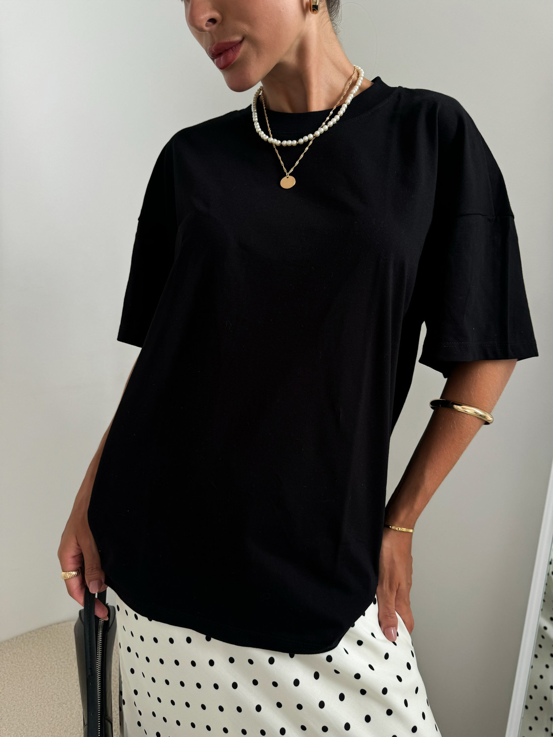 T-shirt oversized lisa, com modelagem ampla e caimento reto que garante conforto e estilo em qualquer ocasião. Confeccionada em meia malha de alta qualidade, possui toque super macio e leve. Ideal para quem busca praticidade, liberdade de movimento e um visual moderno e descomplicado.