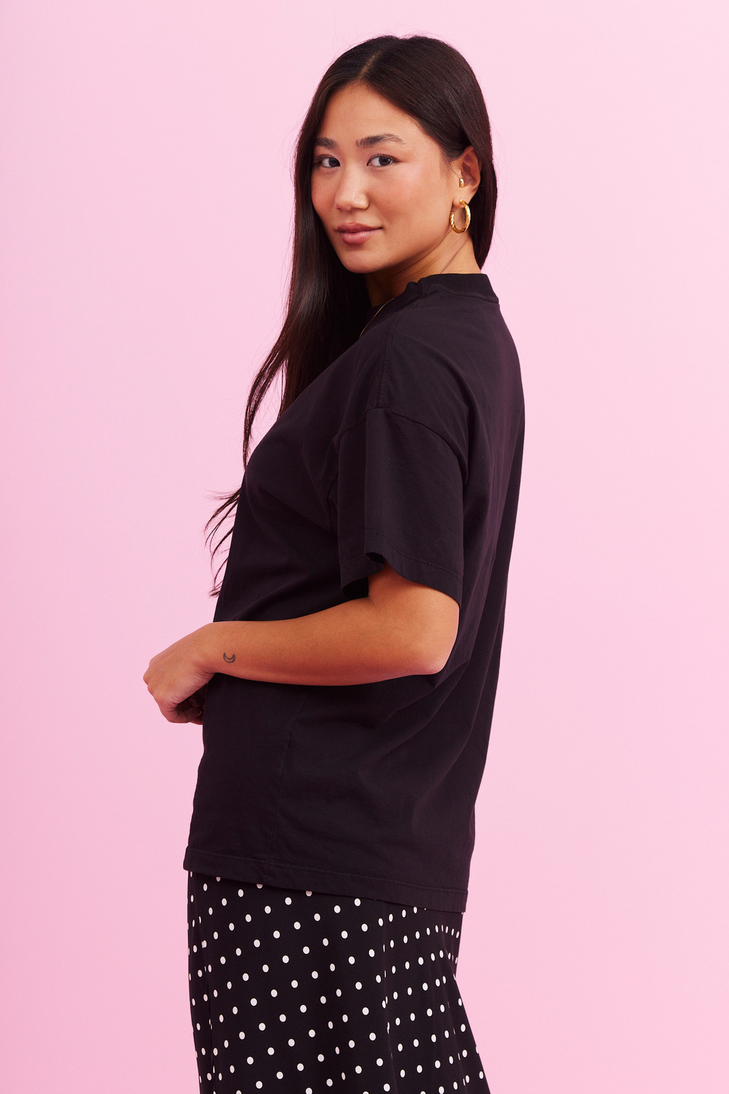 T-shirt oversized lisa, com modelagem ampla e caimento reto que garante conforto e estilo em qualquer ocasião. Confeccionada em meia malha de alta qualidade, possui toque super macio e leve. Ideal para quem busca praticidade, liberdade de movimento e um visual moderno e descomplicado.