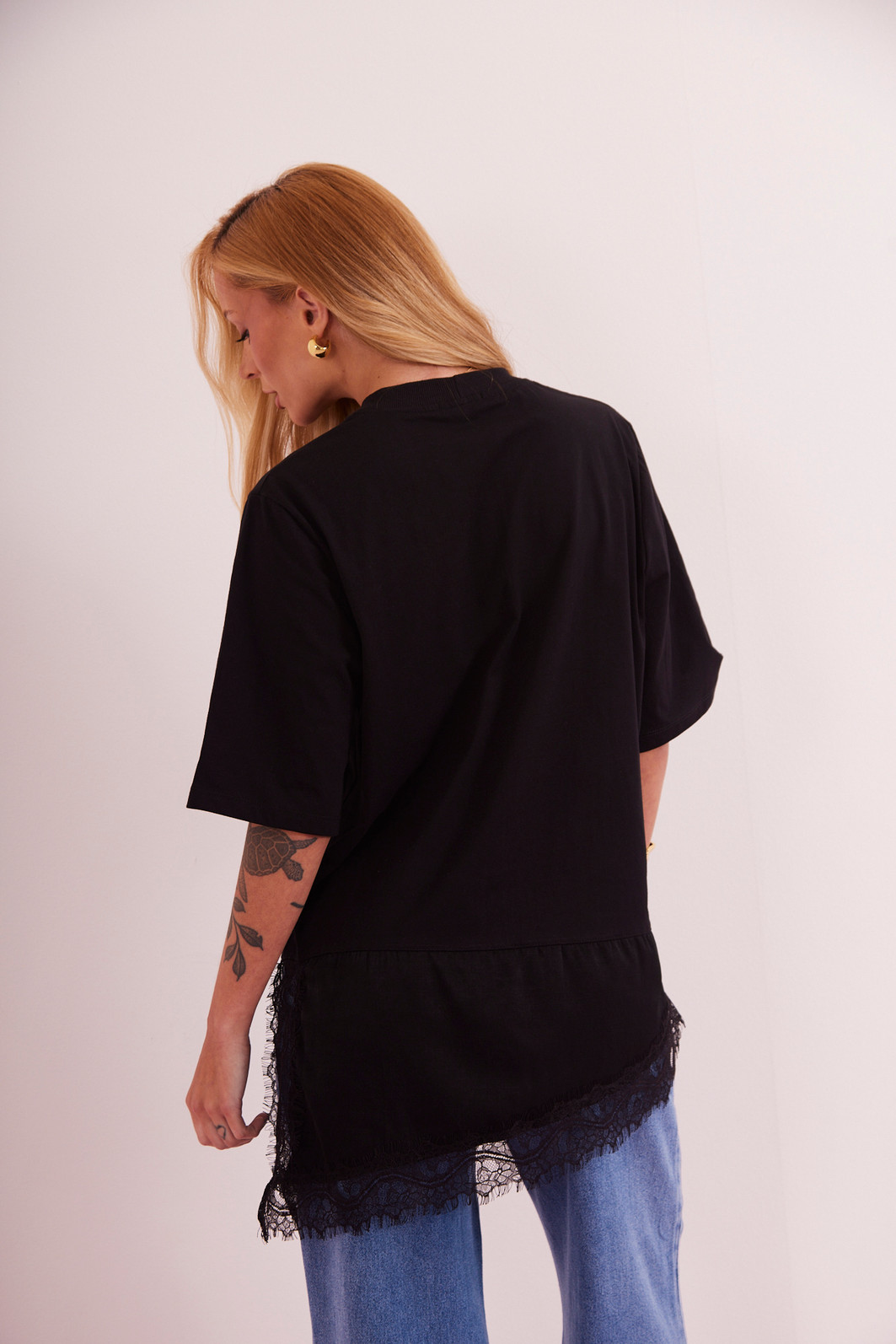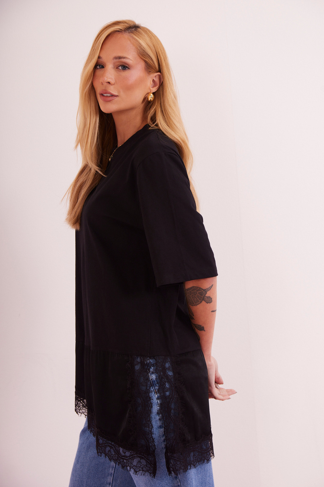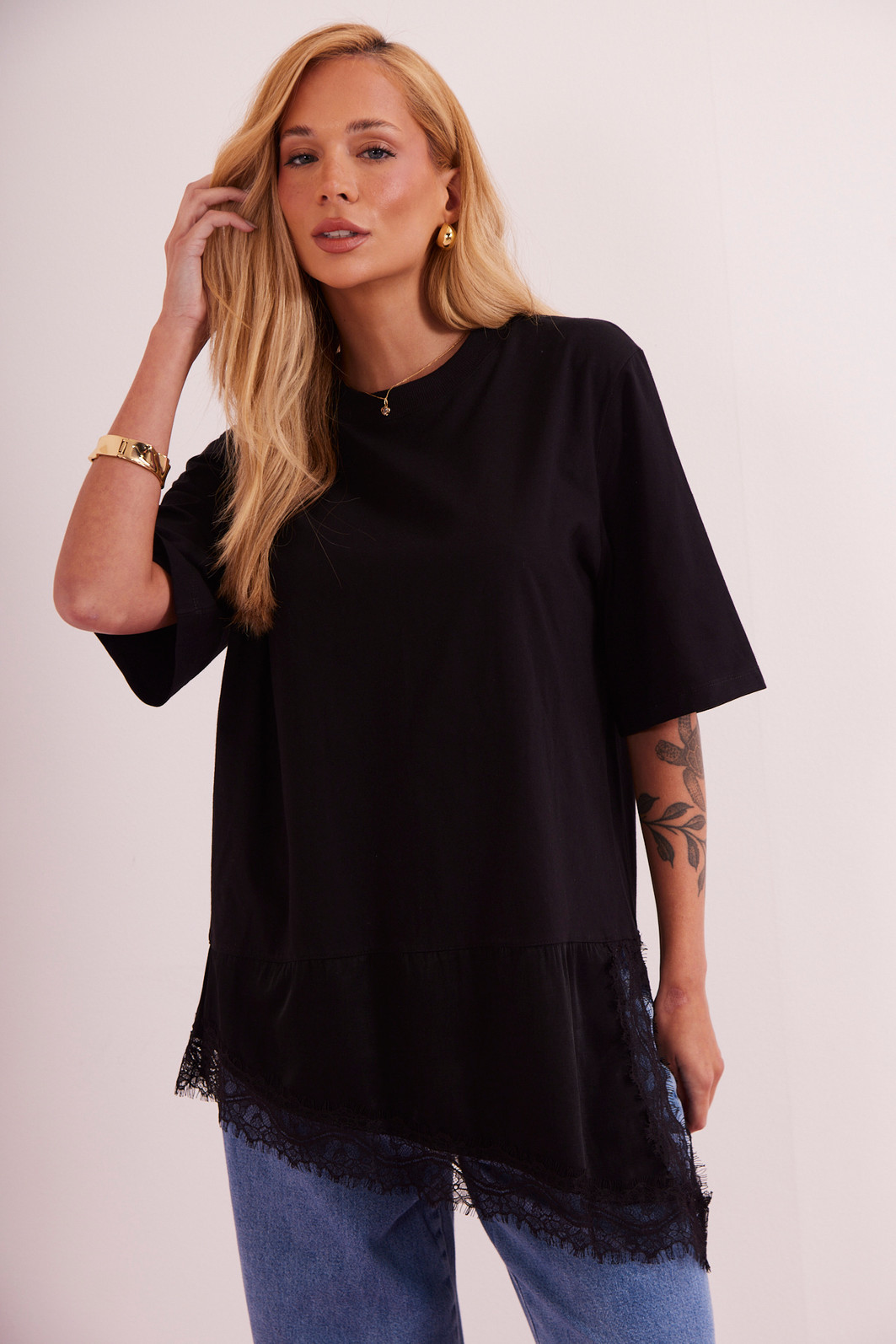 Essa t-shirt over preta é daquelas que abraçam o look com conforto e estilo. A modelagem soltinha garante aquele ar despretensioso e moderno, enquanto a renda delicada na barra traz um toque romântico irresistível. Pra deixar tudo ainda mais especial, a barra assimétrica dá movimento e personalidade à peça. Perfeita pra quem ama conforto sem abrir mão dos detalhes.