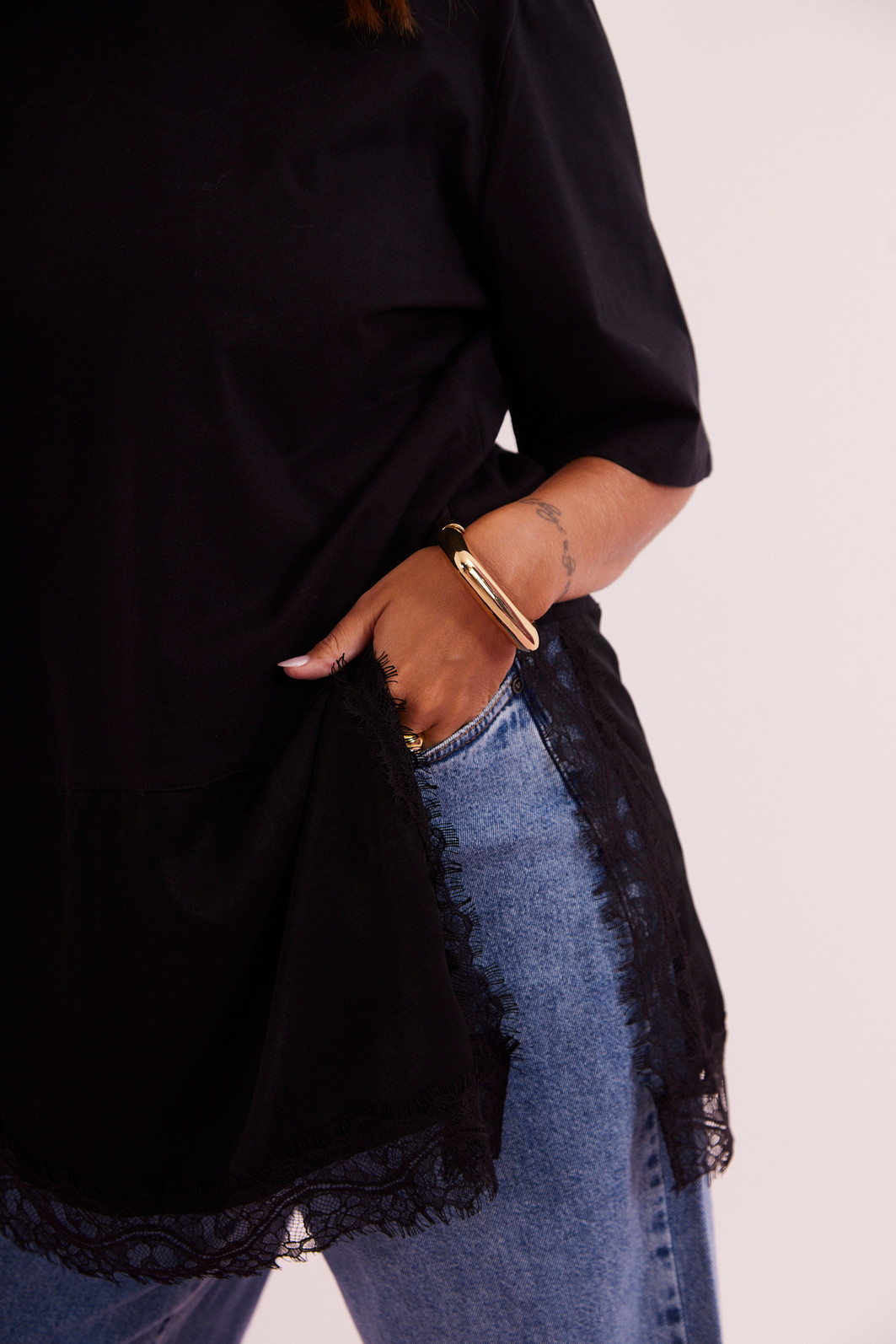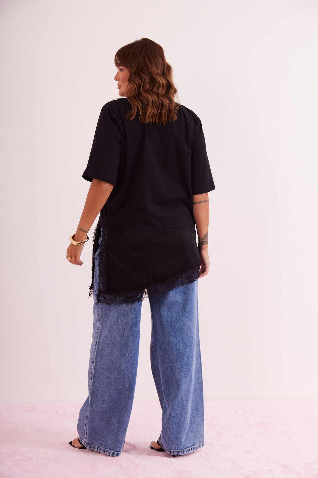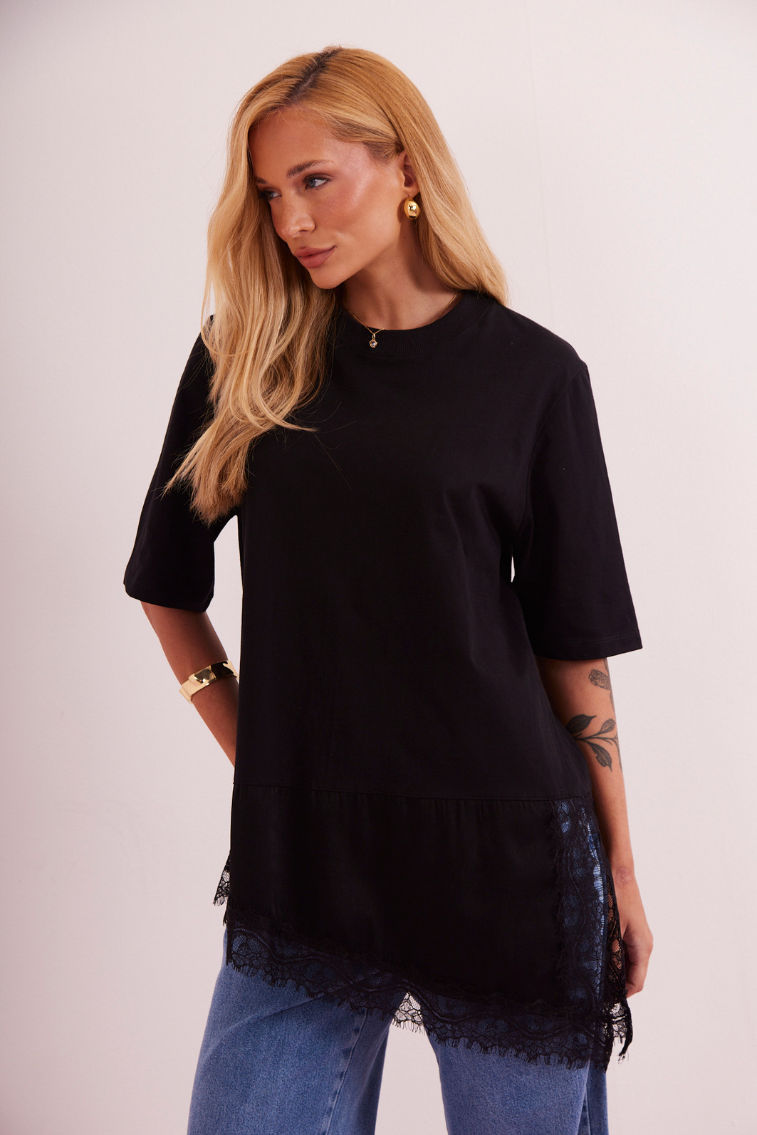 Essa t-shirt over preta é daquelas que abraçam o look com conforto e estilo. A modelagem soltinha garante aquele ar despretensioso e moderno, enquanto a renda delicada na barra traz um toque romântico irresistível. Pra deixar tudo ainda mais especial, a barra assimétrica dá movimento e personalidade à peça. Perfeita pra quem ama conforto sem abrir mão dos detalhes.
