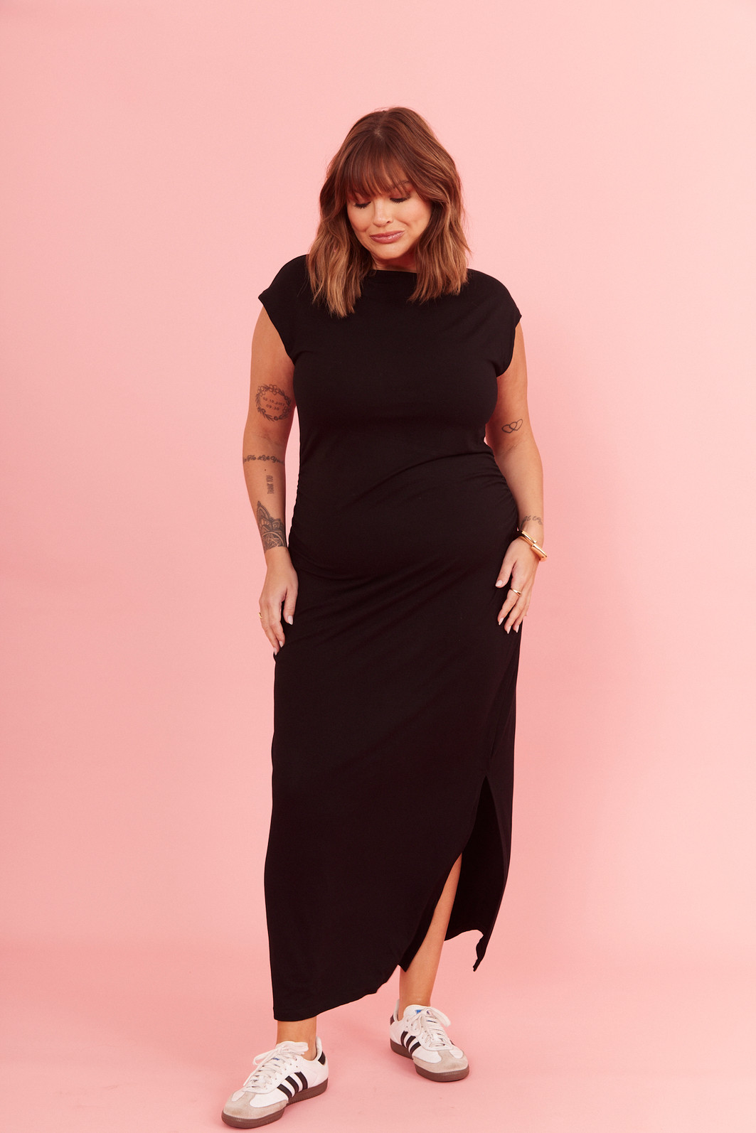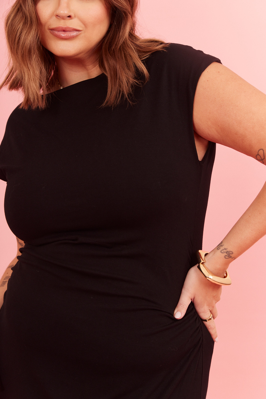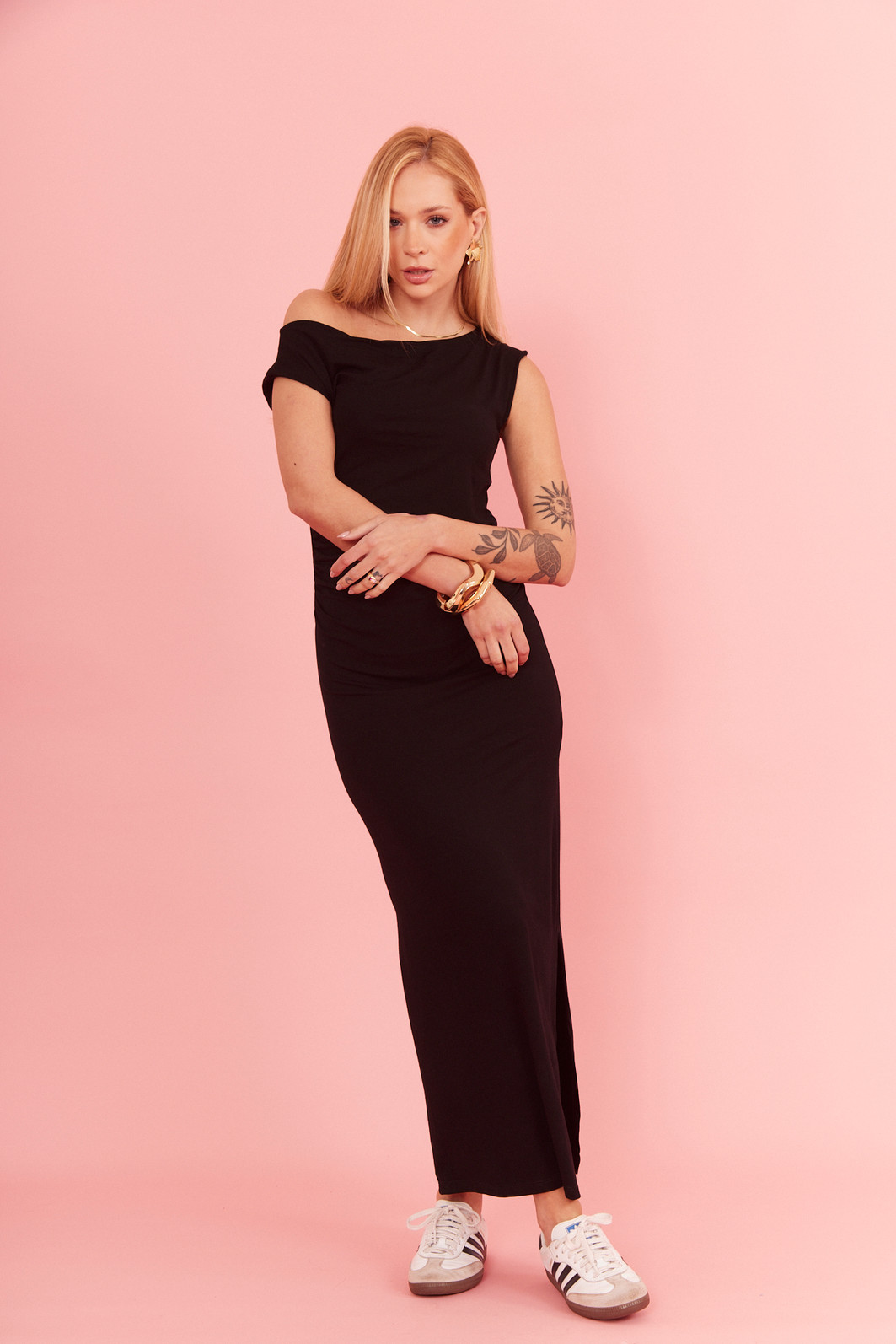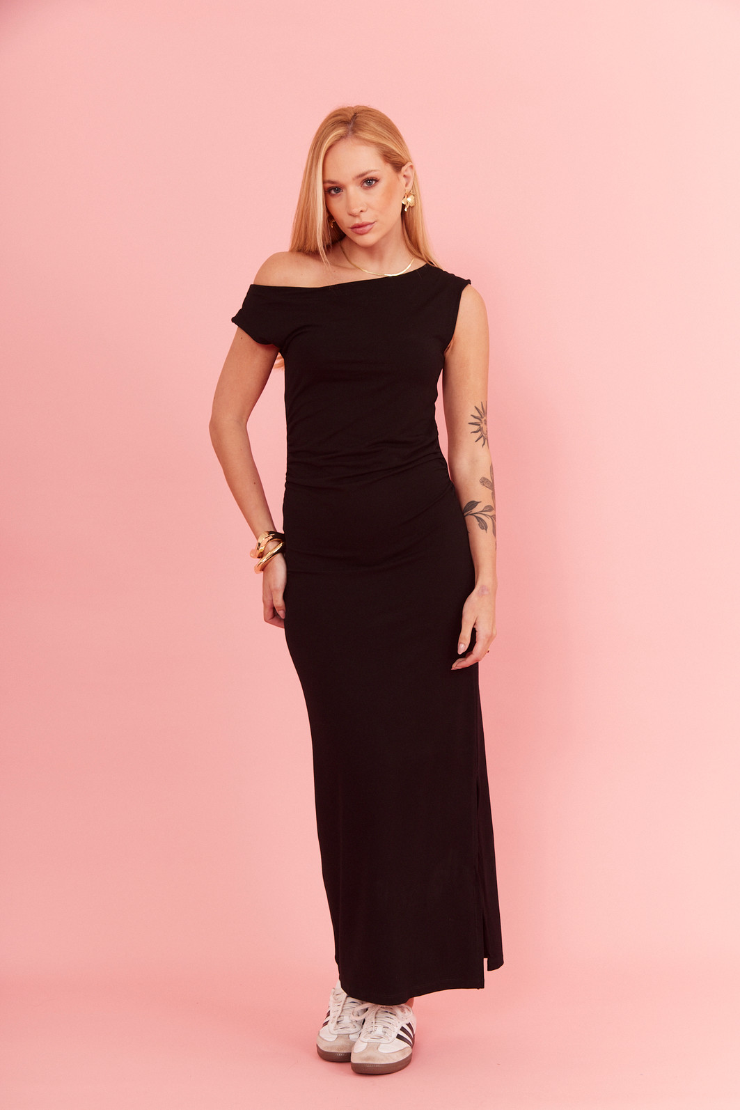 Vestido midi com manga curta e ombro a ombro, possui uma fenda lateral, perfeito para quem busca leveza e elegância. Possui caimento impecável, valorizando a silhueta com muito conforto.