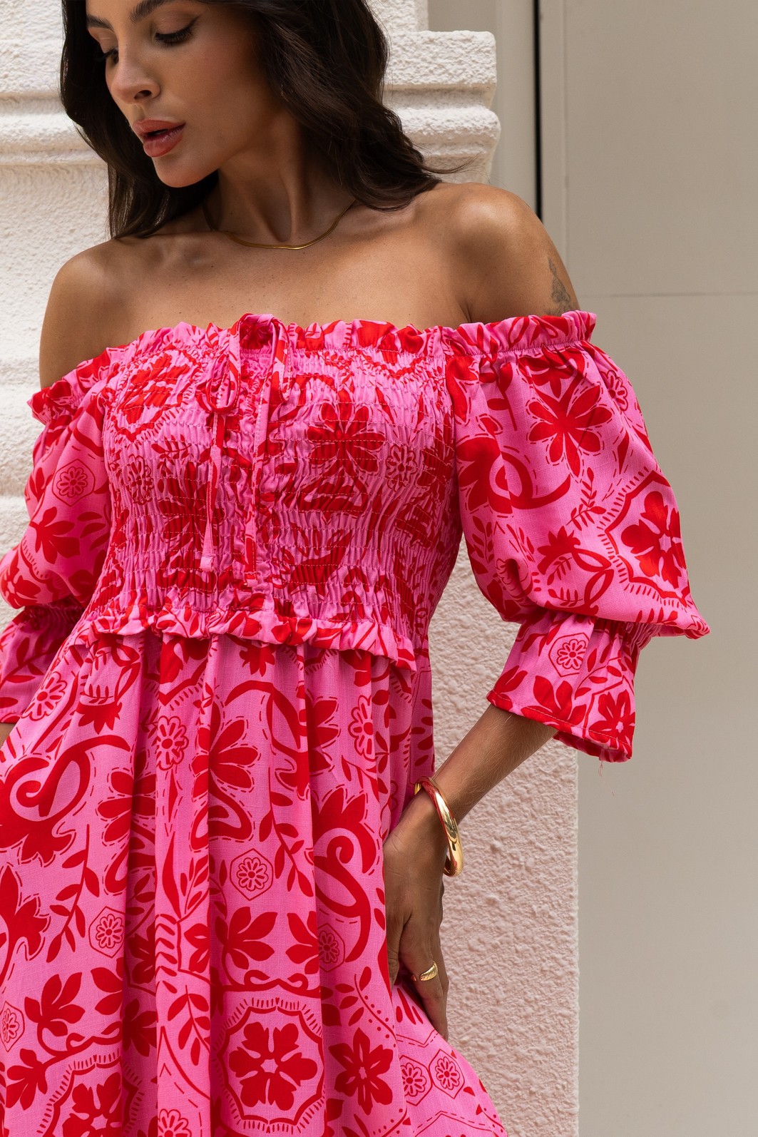 Vestido midi estampado, possuindo manga 3/4 super delicado, com um toque moderno, tecido em viscose. As mangas e os ombros são detalhados com elástico, conforto ajuste perfeito e um charme extra, possuindo tambem lastex na parte de tras e frente. Esse vestido combina conforto e estilo e delicadeza