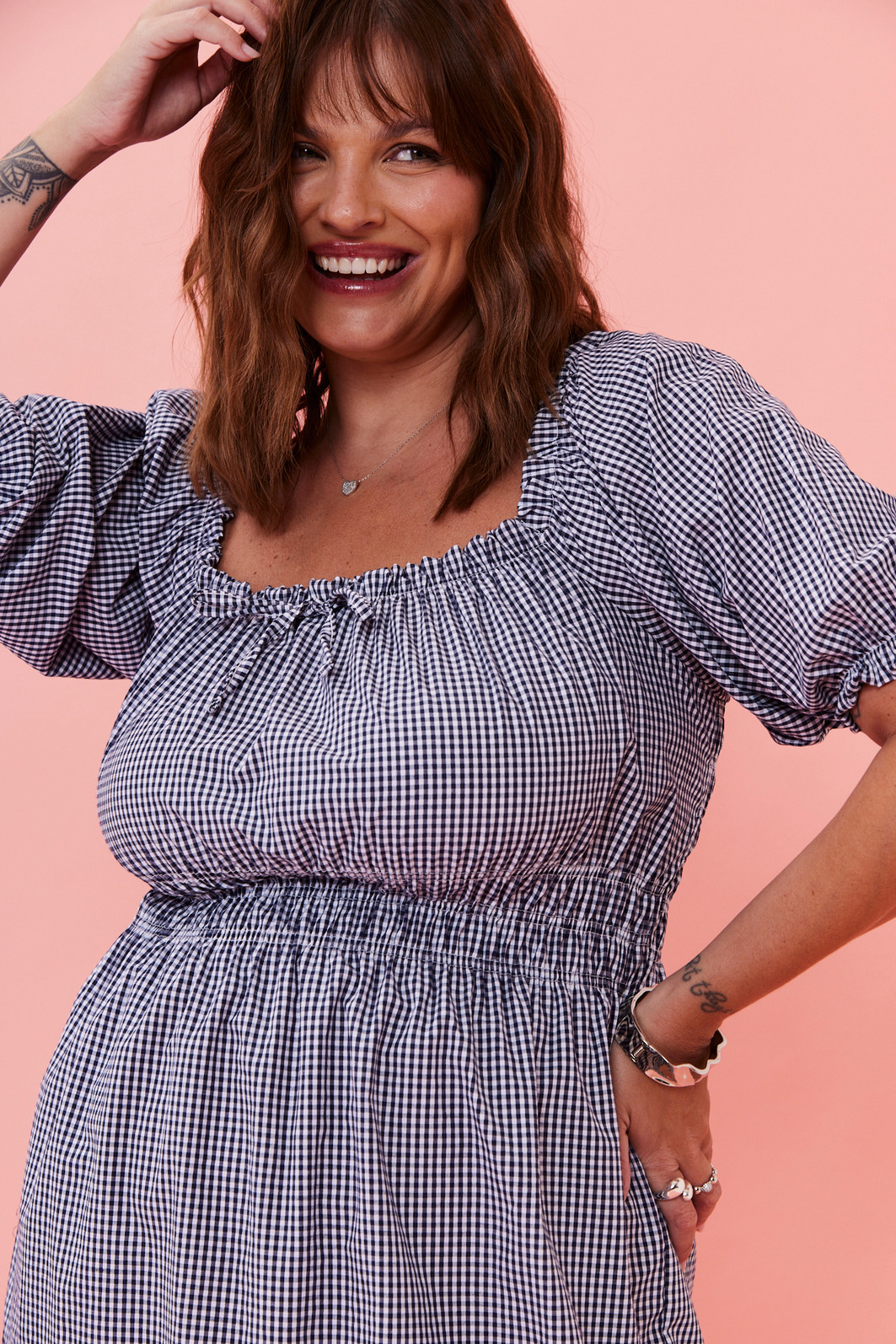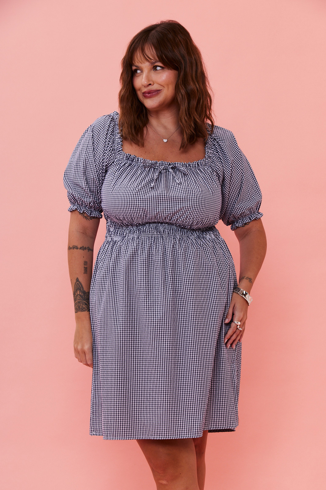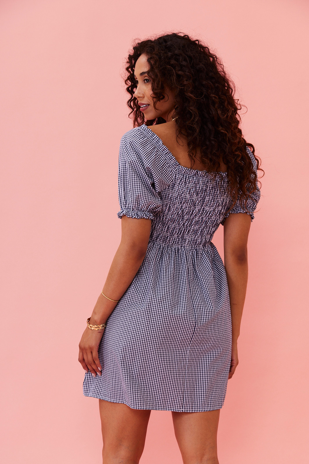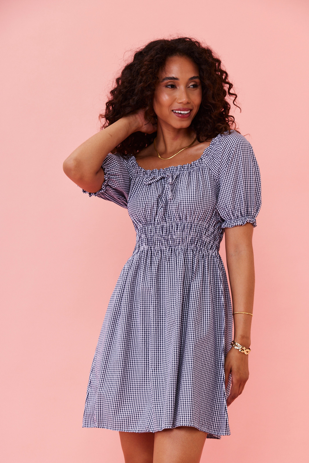 Vestido curto listrado elegante. Possui mangas cutas bufantes, decote quadrado. A saia traz fluidez e movimento. Perfeito para looks frescos e estilosos nos dias quentes!