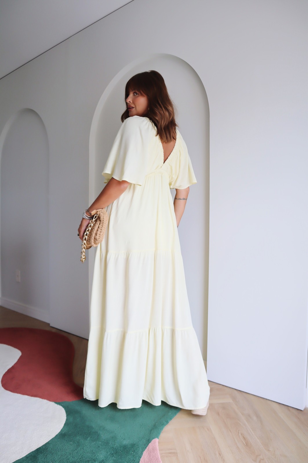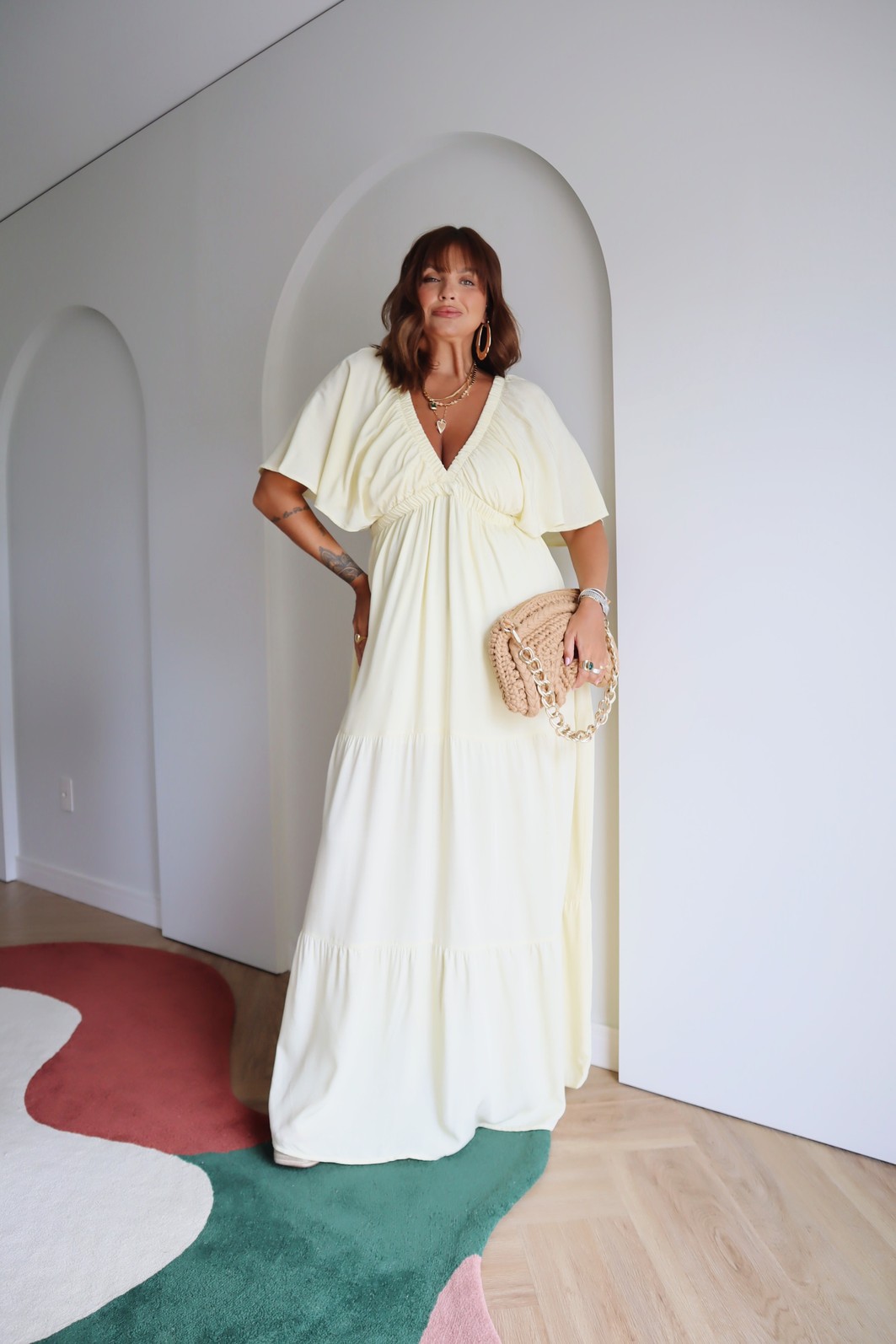 Vestido longo com manga curta, que transmite leveza e elegância. Possui elástico no busto e decote em V, detalhes que adicionam um toque de sofisticação e realçam a silhueta de forma delicada. O ajuste confortável valoriza o corpo sem perder o caimento fluido, criando um visual feminino e moderno.