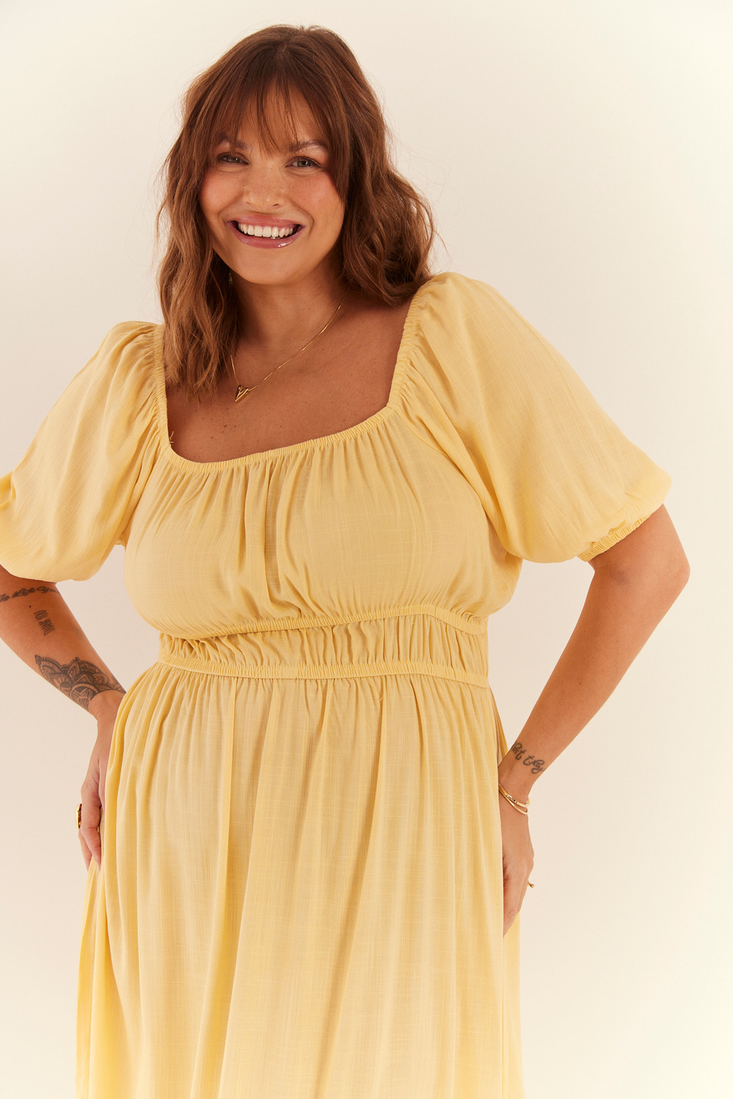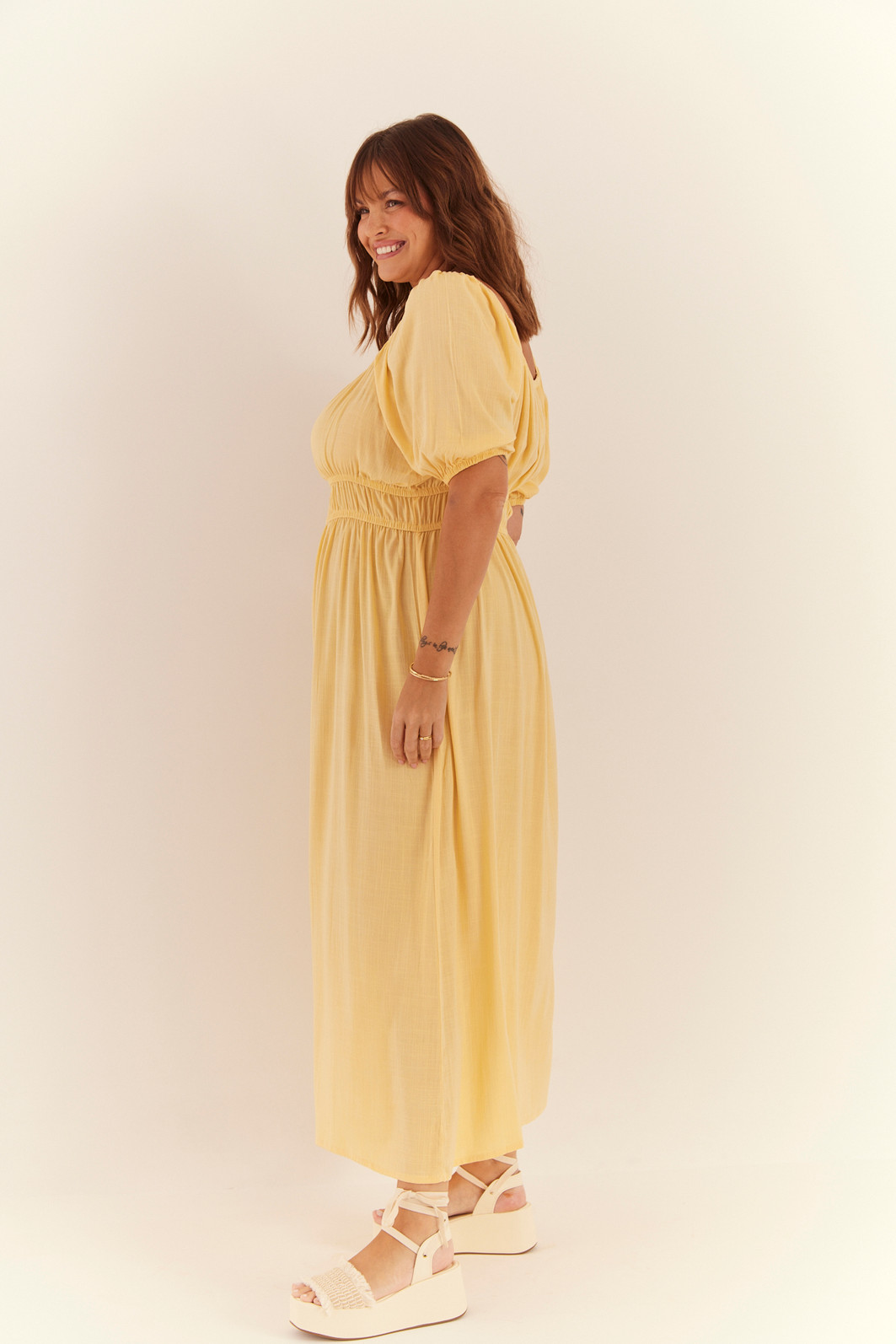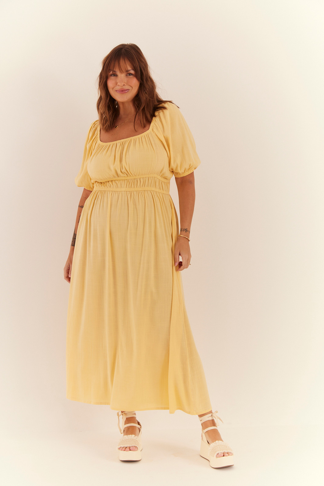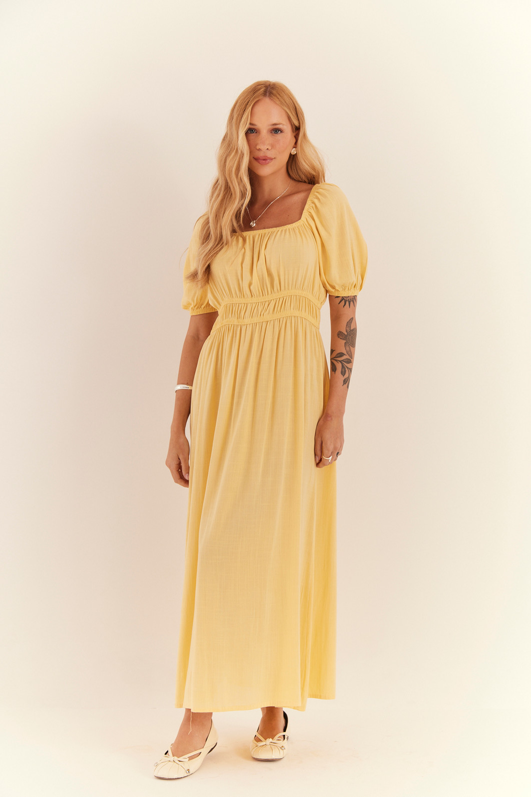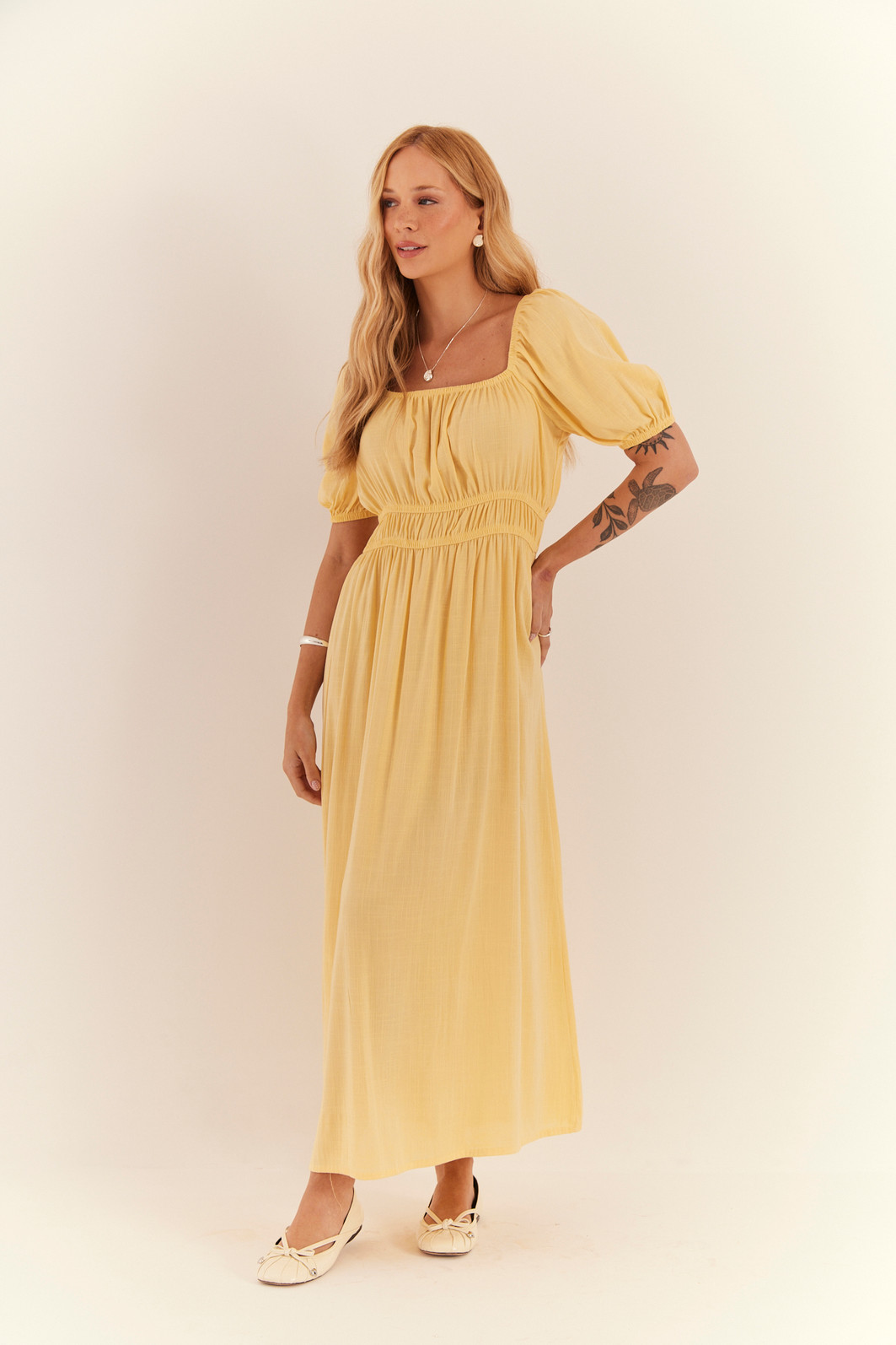 Vestido com decote quadrado e mangas curtas, trazendo um toque de delicadeza e sofisticação. O comprimento midi confere elegância, enquanto o detalhe de fenda adiciona um charme extra à peça. Perfeito para ocasiões especiais, esse vestido combina feminilidade e estilo de forma única. Possui elástico na parte da cintura, logo abaixo do busto.