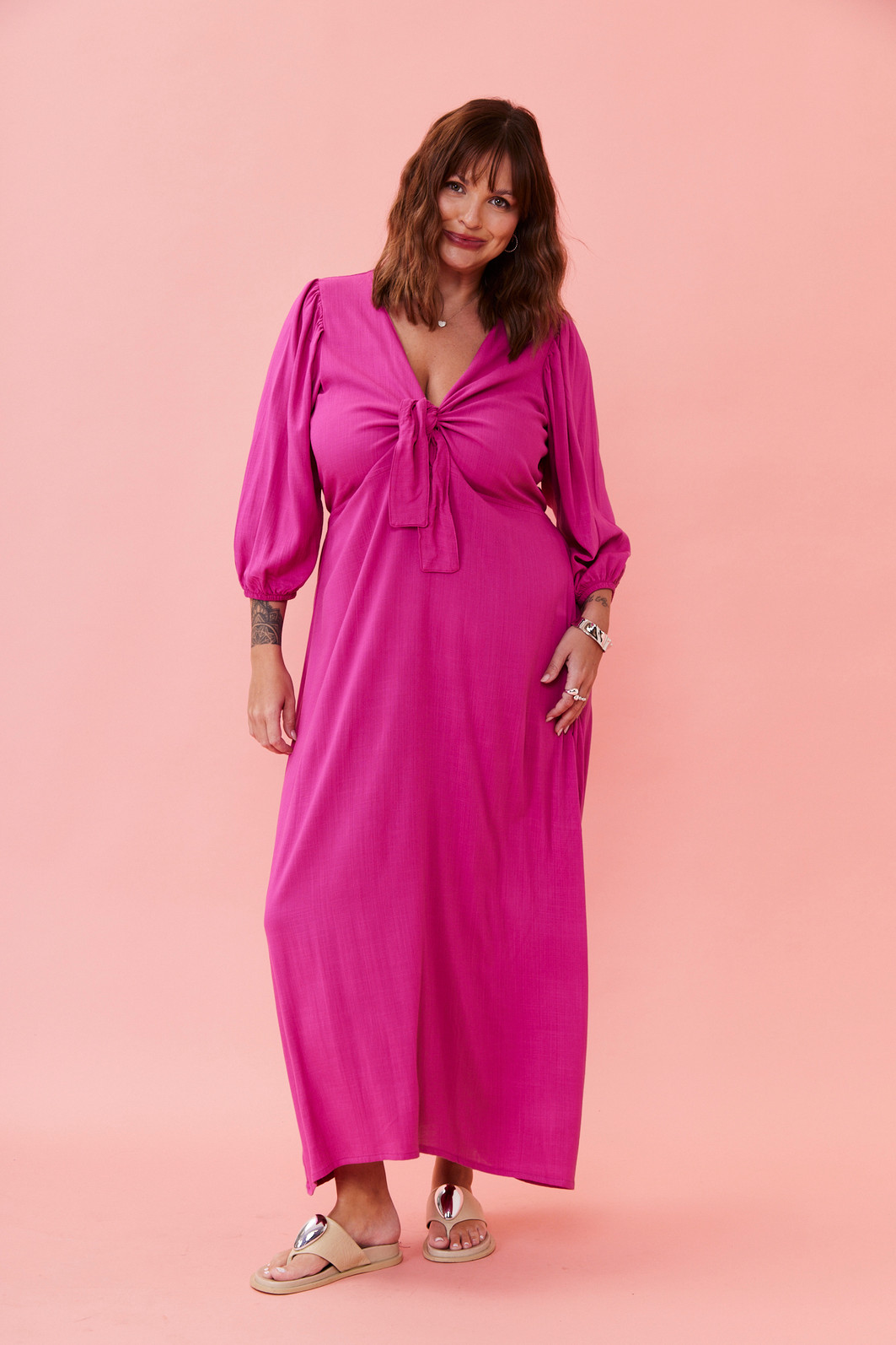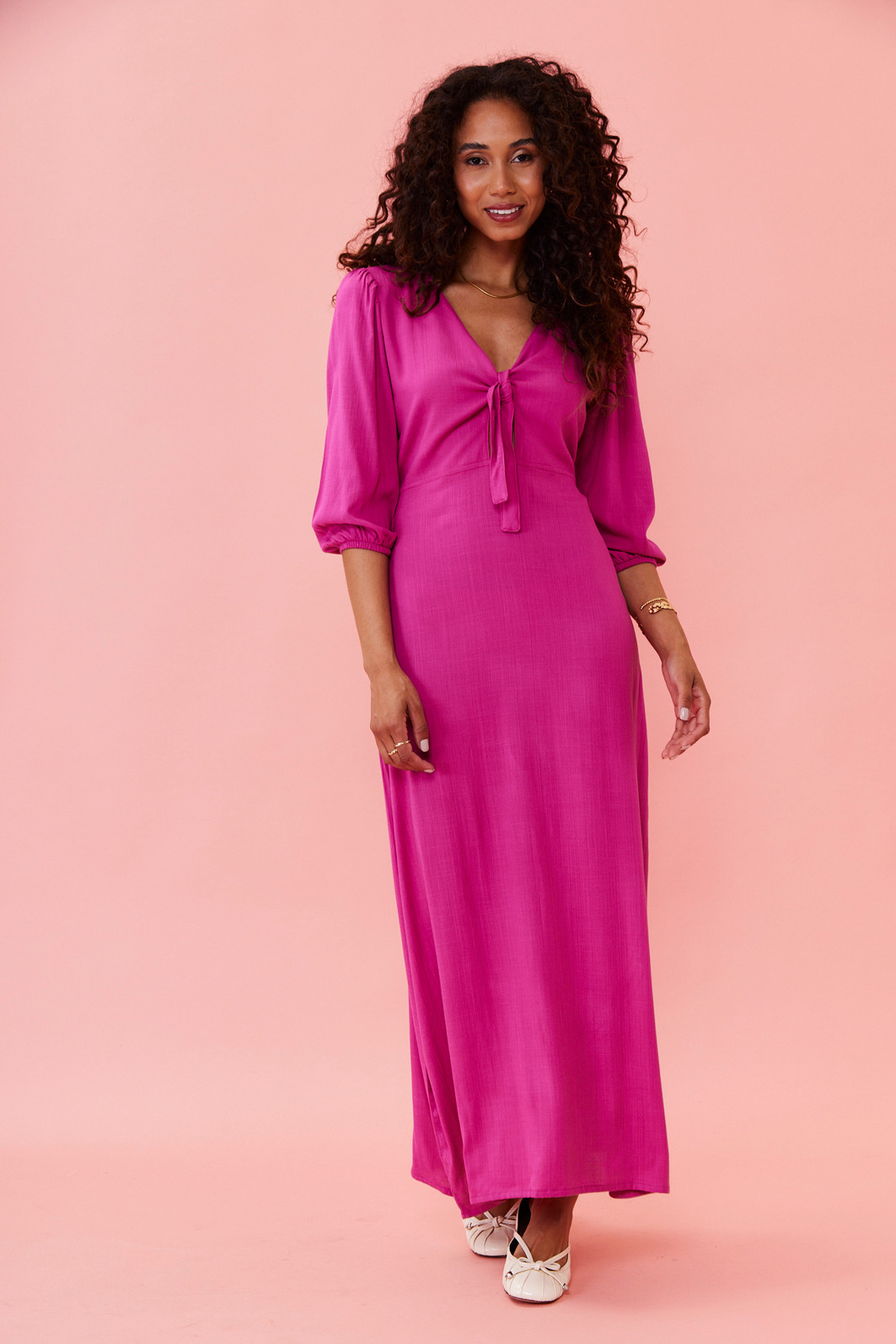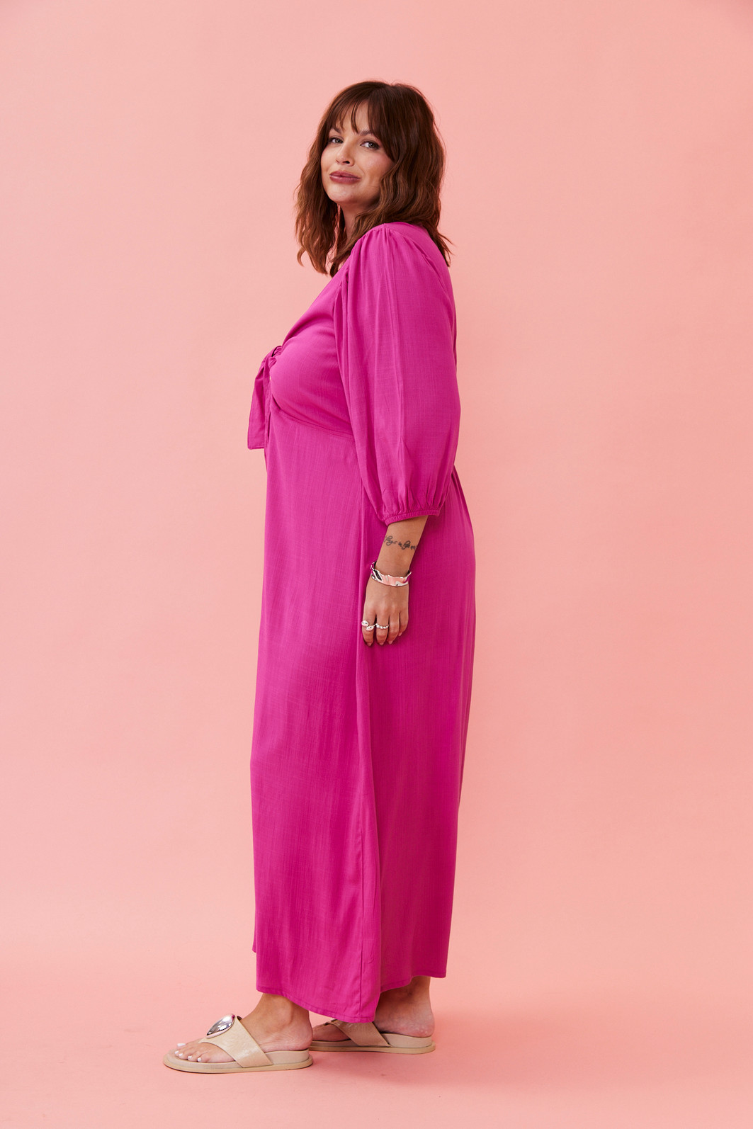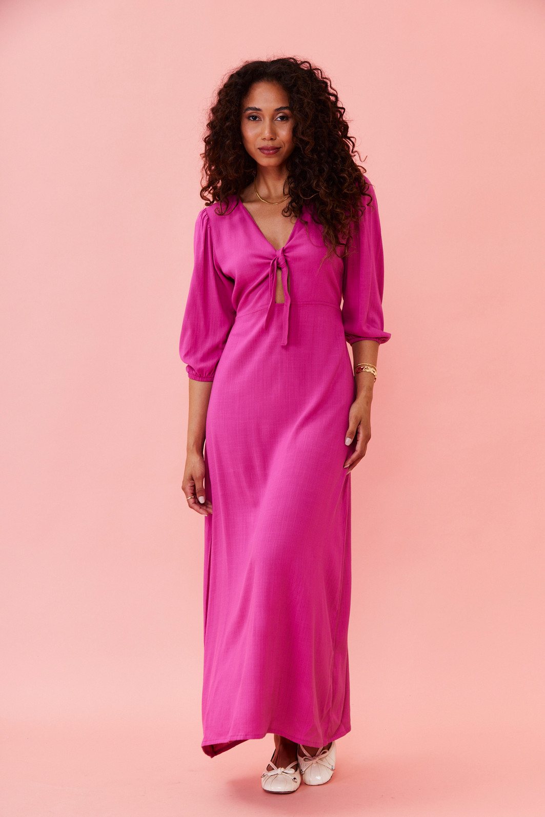 Vestido pink midi com tecido leve, modelagem solta ao corpo, amarração no busto e cintura levemente marcada. Perfeito para usar no dia a dia, em viagens ou em ocasiões informais com muito estilo.