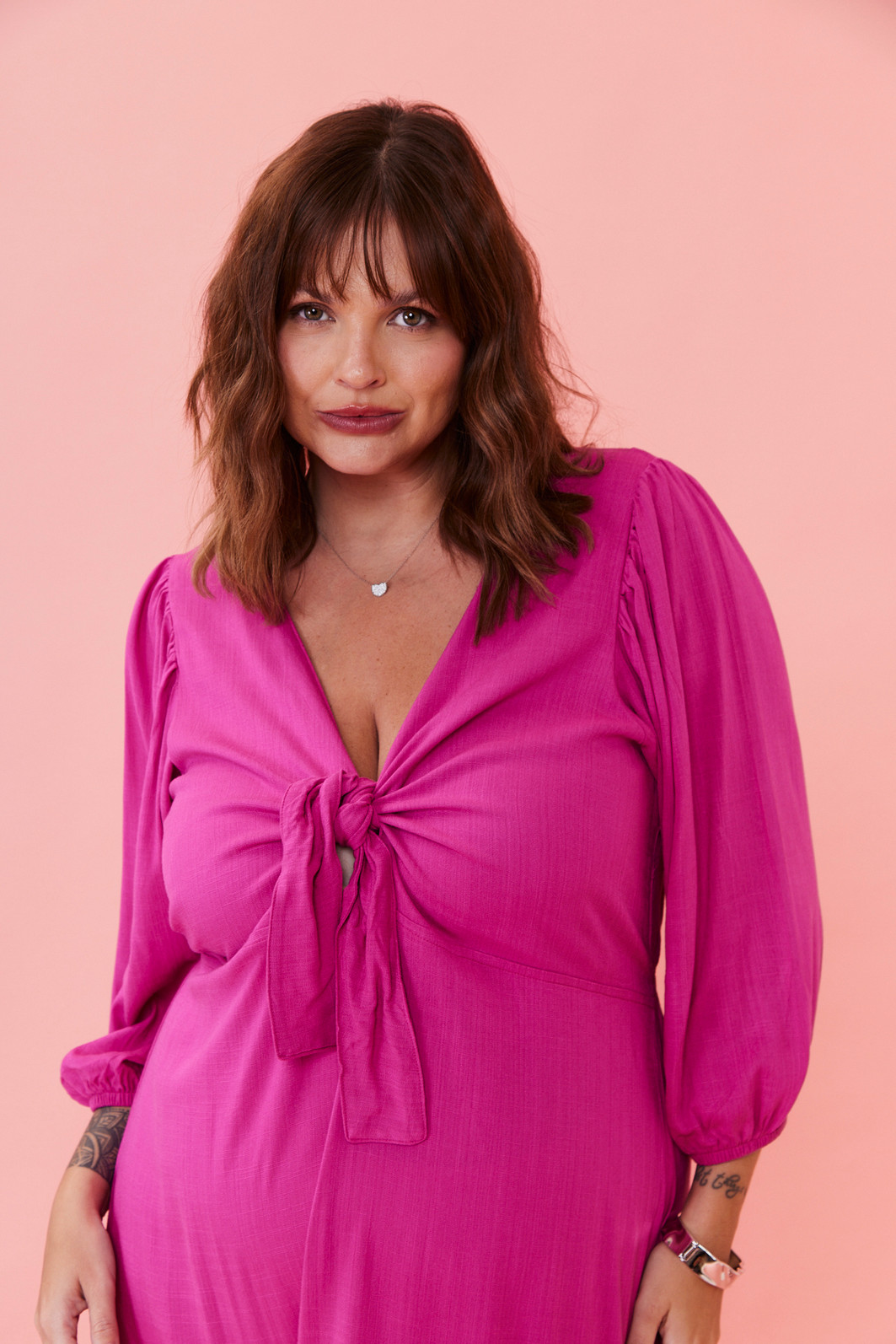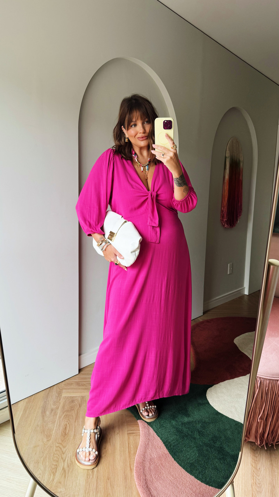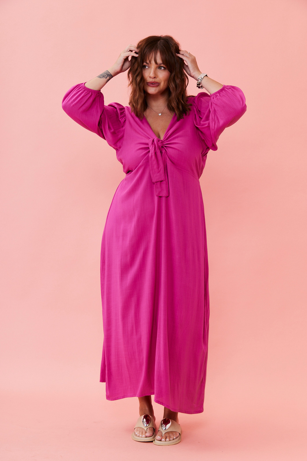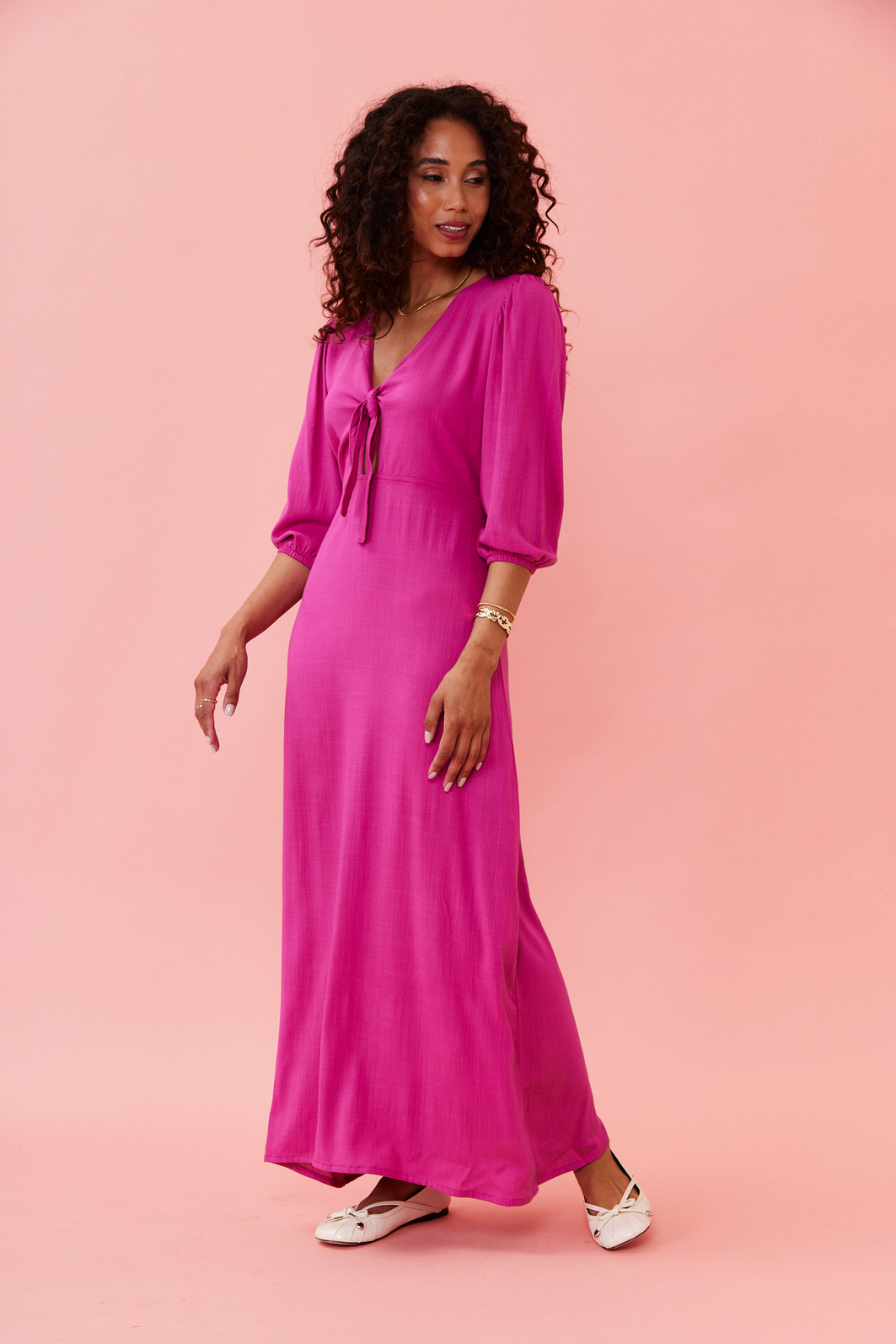 Vestido pink midi com tecido leve, modelagem solta ao corpo, amarração no busto e cintura levemente marcada. Perfeito para usar no dia a dia, em viagens ou em ocasiões informais com muito estilo.