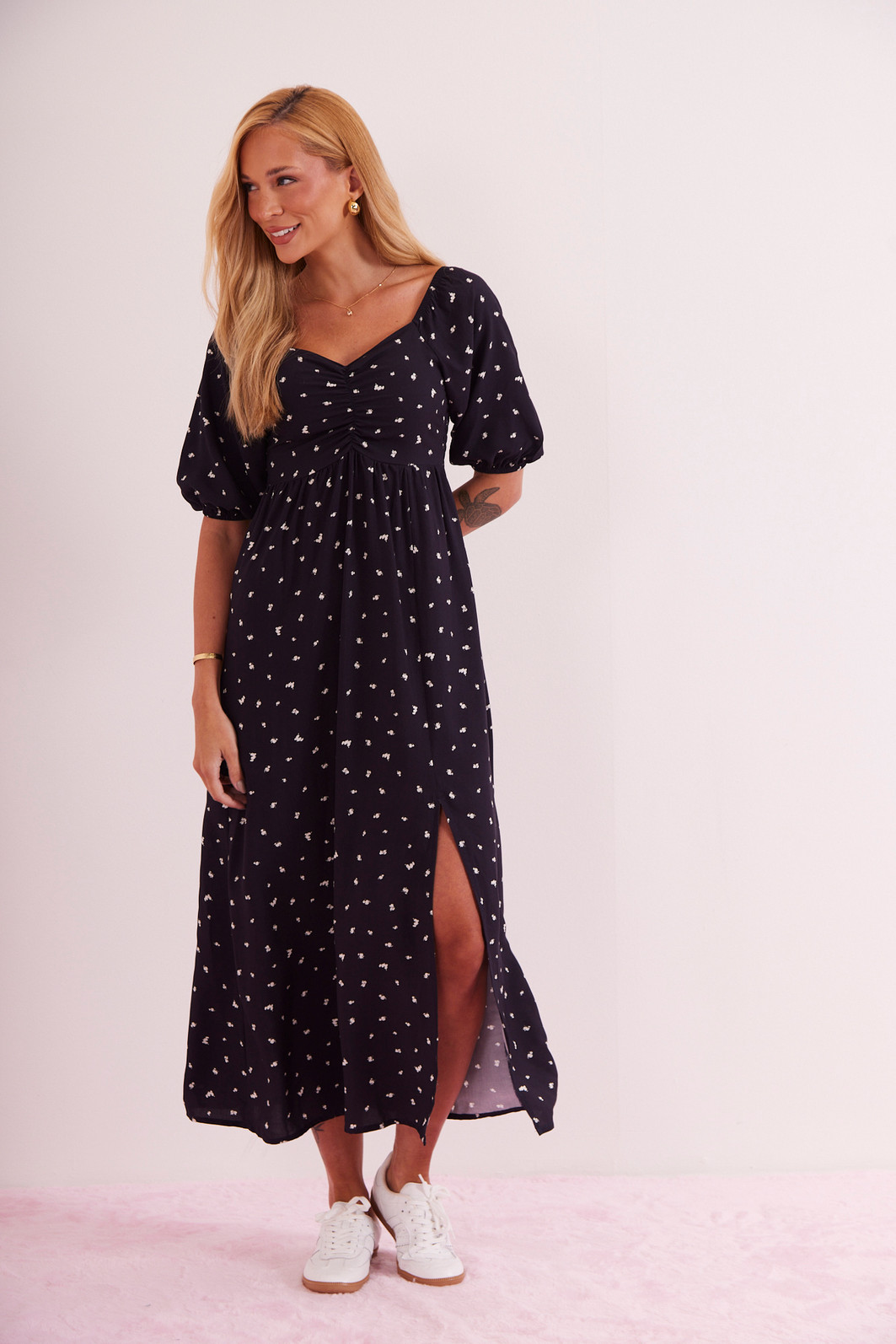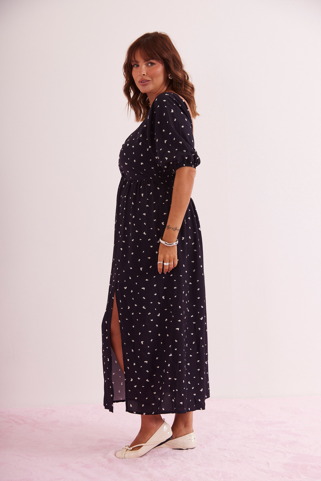 Vestido com decote princesa e mangas 3/4 bufantes, trazendo um toque de delicadeza e sofisticação. O comprimento midi confere elegância, enquanto o detalhe de fenda adiciona um charme extra à peça. Perfeito para ocasiões especiais, esse vestido combina feminilidade e estilo de forma única. Possui lastex na parte de trás do vestido dando uma firmeza a mais na hora de vestir.