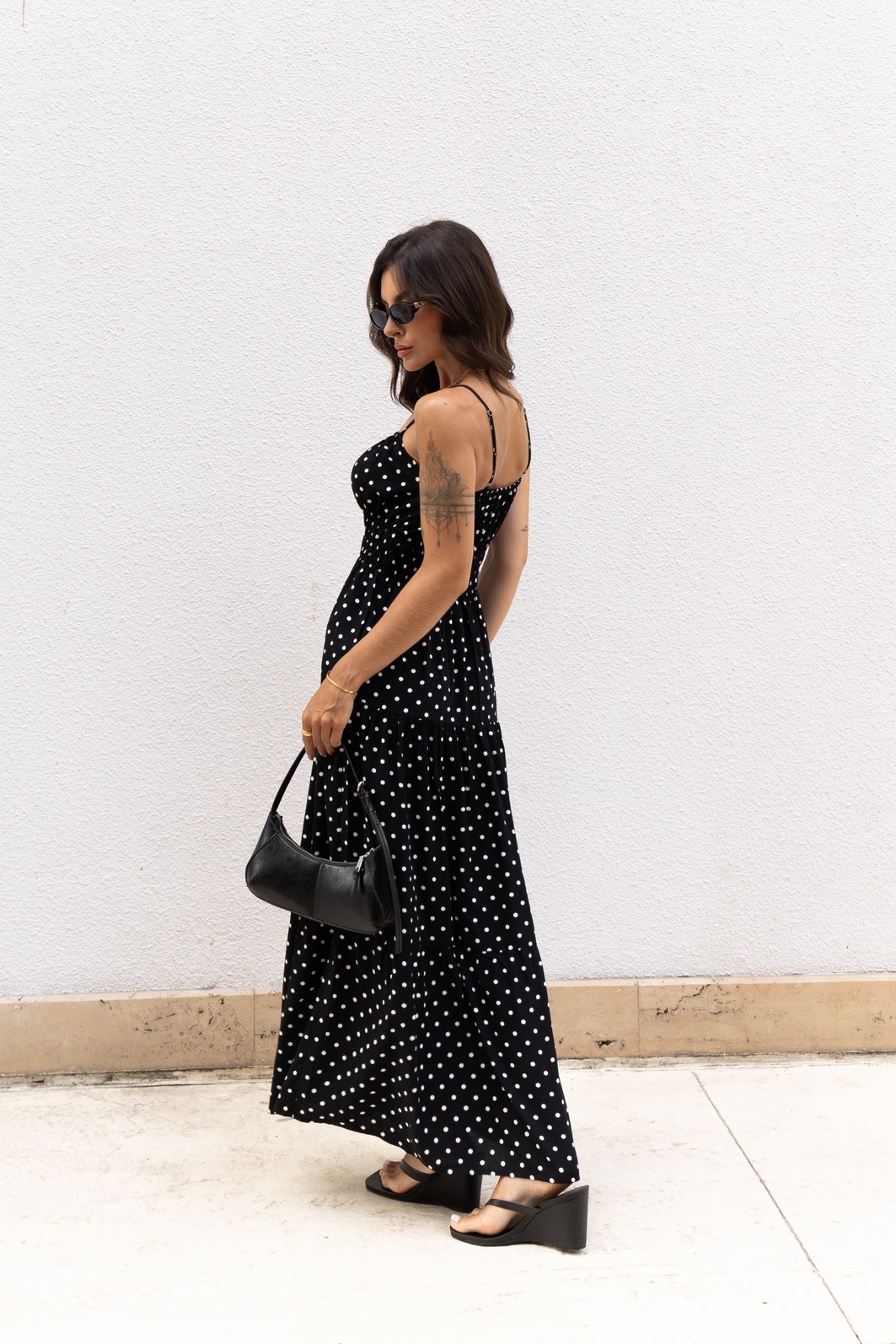 Vestido midi em viscose com estampada em poá, lastex na paerte da cintura que garantem ajuste perfeito e delicadeza ao visual. Leve e feminino, é a peça ideal para compor produções cheias de graça e sofisticação.